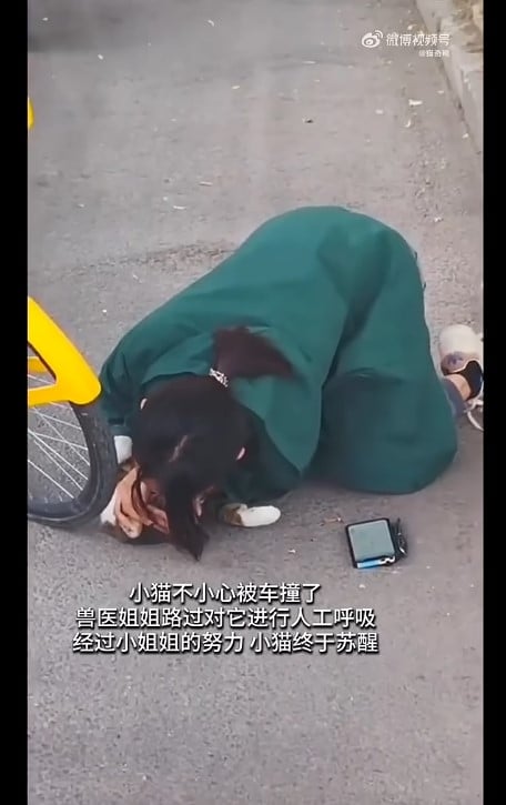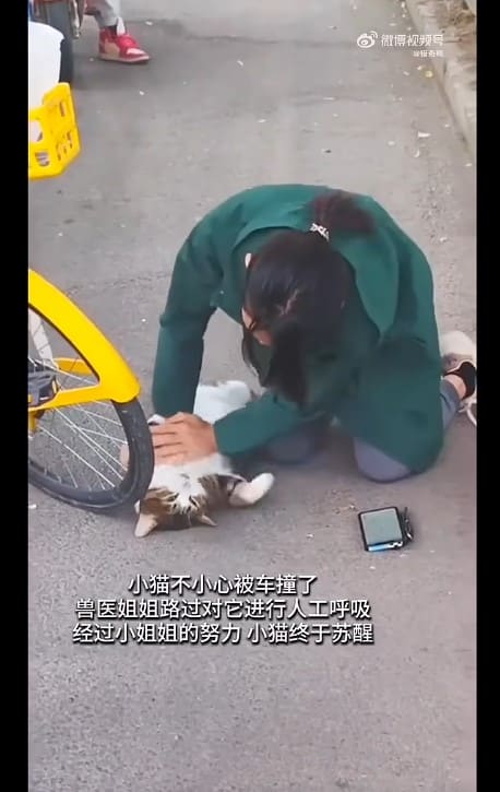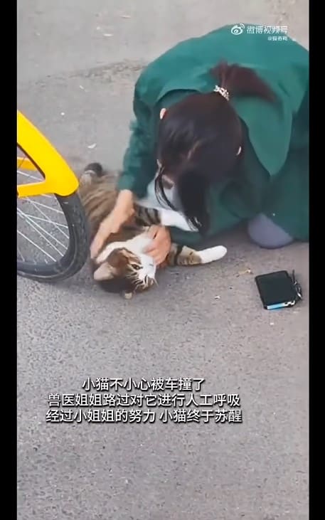 กลายเป็นคลิปที่ถูกแชร์และถูกพูดถึงอย่างมากในโลกออนไลน์ของจีน หลังจากที่แมวจรจัดตัวหนึ่งเกิดอุบัติเหตุถูกรถจักรยานยนต์ชนจนนอนแน่นิ่งอยู่บนถนน และดูเหมืนอว่ามันกำลังจะตาย แต่จู่ๆ ก็มีหมอสาวรายหนึ่งที่ผ่านมาเห็นเหตุการณ์ เธอไม่รอช้า เข้าไปรีบทำ CPR ช่วยแมวตัวนั้นทันที เธอลงไปคุกเข่าข้างแมวตัวนั้น และเริ่มปฐมพยาบาลด้วยการทำ CPR ทั้งการปั๊มหัวใจ เป่าปาก และตบหลัง ทำเอาชาวเน็ตลุ้นกันไปตามๆกัน
