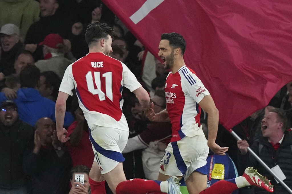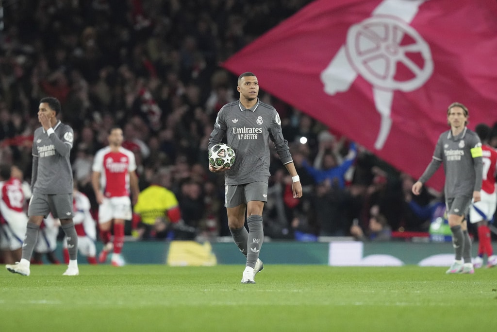 Arsenal’s Declan Rice, left, controls the ball past Real Madrid’s Luka Modric, right, during the Champions League quarterfinal first leg soccer match between Arsenal and Real Madrid at the Emirates Stadium in London, Tuesday, April 8, 2025. (AP Photo/Frank Augstein)Real Madrid’s Kylian Mbappe, center, reacts after Arsenal’s Declan Rice scored his side’s second goal during the Champions League quarterfinal first leg soccer match between Arsenal and Real Madrid at the Emirates Stadium in London, Tuesday, April 8, 2025. (AP Photo/Frank Augstein)Arsenal’s Declan Rice, left, celebrates after scoring his side’s second goal during the Champions League quarterfinal first leg soccer match between Arsenal and Real Madrid at the Emirates Stadium in London, Tuesday, April 8, 2025. (AP Photo/Frank Augstein)Arsenal’s Mikel Merino, right, celebrates with his teammates after scoring his side’s third goal during the Champions League quarterfinal first leg soccer match between Arsenal and Real Madrid at the Emirates Stadium in London, Tuesday, April 8, 2025. (AP Photo/Frank Augstein)Arsenal’s Declan Rice, left, scores his side’s opening goal during the Champions League quarterfinal first leg soccer match between Arsenal and Real Madrid at the Emirates Stadium in London, Tuesday, April 8, 2025. (AP Photo/Frank Augstein)Real Madrid’s Kylian Mbappe, right, is challenged by Arsenal’s William Saliba during the Champions League quarterfinal first leg soccer match between Arsenal and Real Madrid at the Emirates Stadium in London, Tuesday, April 8, 2025. (AP Photo/Frank Augstein)