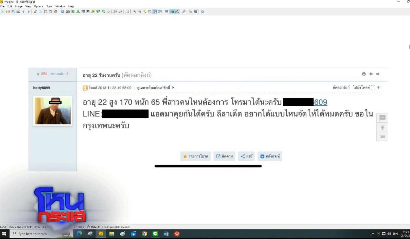 ข้อมูลดังกล่าวปรากฎเป็นภาพแอคเคาท์หนุ่มรายหนึ่ง โพสต์ข้อความ รับงาน 18+ ระบุว่า “อายุ 22 สูง 170 หนัก 65 พี่สาวคนไหนต้องการ โทรมาได้นะครับ 0……..609 LINE : …… แอดมาคุยกันได้ครับ ลีลาเด็ด อยากได้แบบไหนจัดให้ได้หมดครับ ขอในกรุงเทพนะครับ” ทั้งนี้ข้อความดังกล่าวถูกโพสต์ตั้งแต่วันที่ 23 พฤศจิกายน 2013 เวลา 19.58 น.