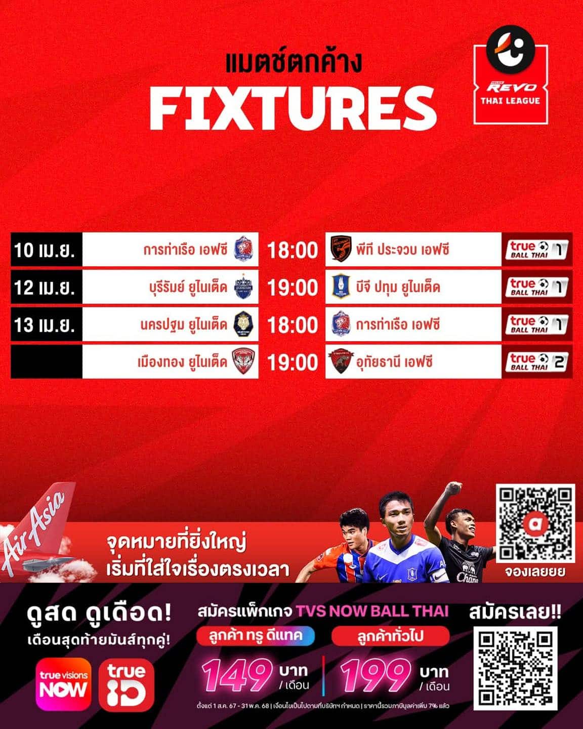 ตารางแข่งขัน รีโว่ 2024/25 ไทยลีก โปรแกรมฟุตบอลไทยลีก นัดตกค้าง ทุกคู่ถ่ายทอดสดทาง AIS Play และ True Ball Thai