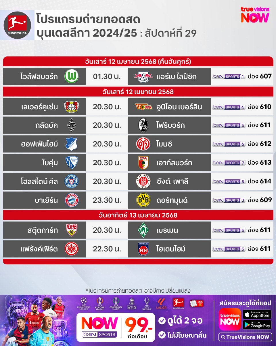 โปรแกรม บุนเดสลีกา เยอรมัน ประจำฤดูกาล 2024/25 สัปดาห์ที่ 29 ทุกคู่ ทางช่อง beIN Sports