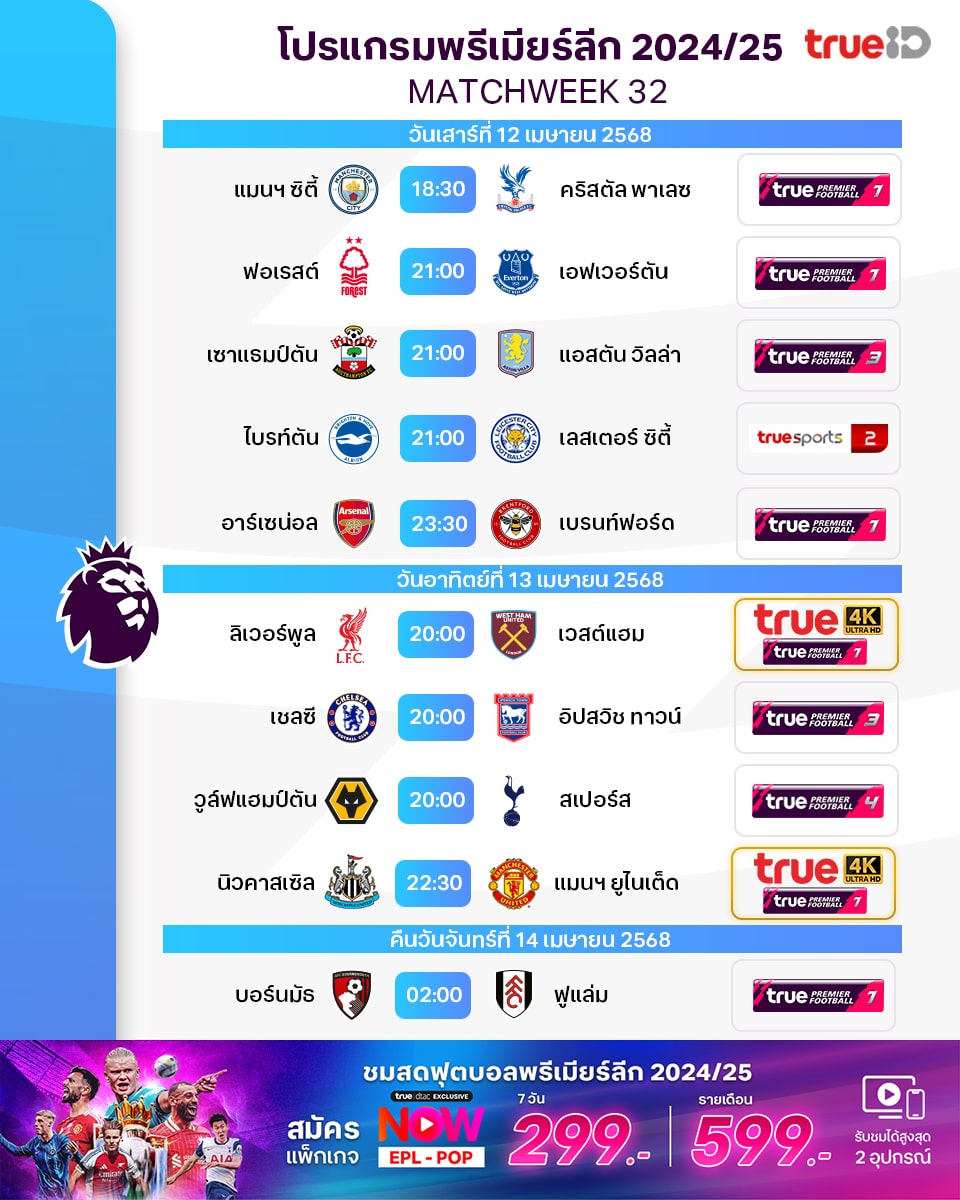 โปรแกรมพรีเมียร์ลีก 2024/25 สัปดาห์ที่ 32 แข่งวันที่ 12-14 เม.ย. นี้ ตารางแข่งพร้อมช่องดูบอลสด