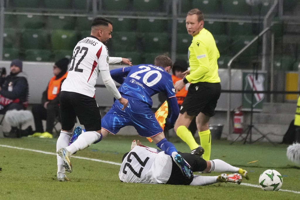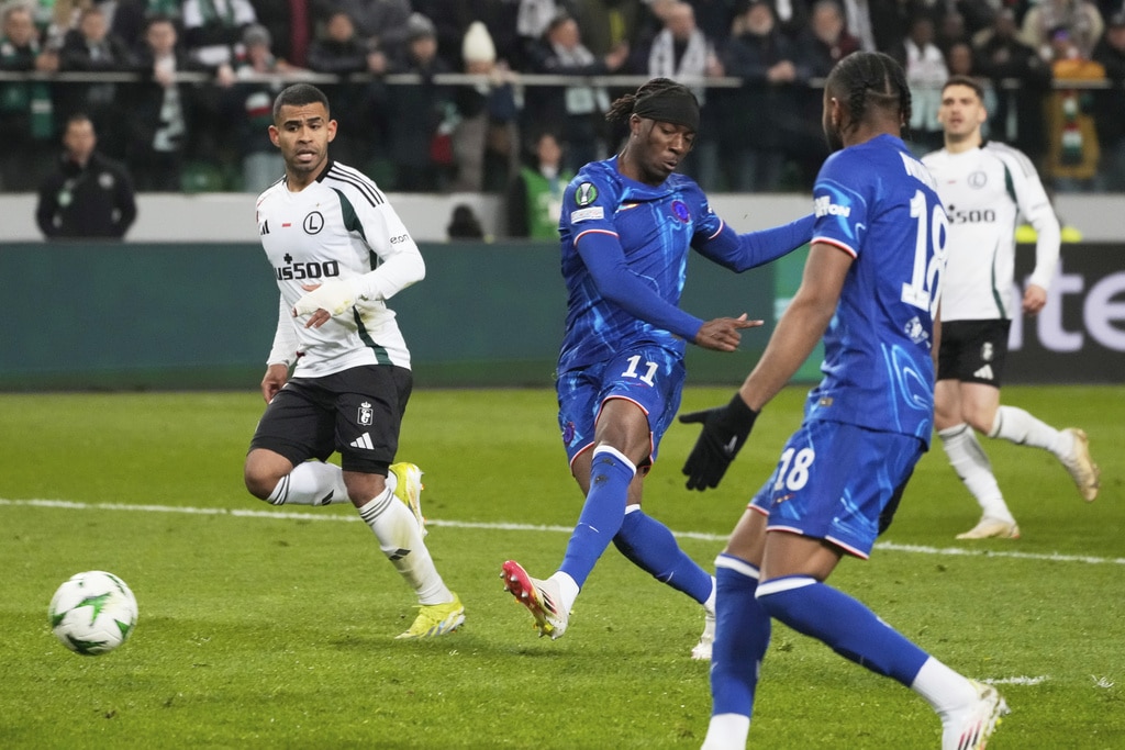 Chelsea’s Malo Gusto, center, jumps for the ball during the Europa Conference League first-leg quarterfinals soccer match between Legia Warszawa and Chelsea at the Marshall Jozef Pilsudski’s Municipal stadium in Warsaw, Poland, Thursday, April 10, 2025. (AP Photo/Czarek Sokolowski)Chelsea’s Noni Madueke, right, celebrates with his teammates after scoring the second goal against Legia during the Europa Conference League first-leg quarterfinals soccer match between Legia Warszawa and Chelsea at the Marshall Jozef Pilsudski’s Municipal stadium in Warsaw, Poland, Thursday, April 10, 2025. (AP Photo/Czarek Sokolowski)Chelsea’s Noni Madueke, center, shoots the ball as scores the second goal against a Legia during the Europa Conference League first-leg quarterfinals soccer match between Legia Warszawa and Chelsea at the Marshall Jozef Pilsudski’s Municipal stadium in Warsaw, Poland, Thursday, April 10, 2025. (AP Photo/Czarek Sokolowski)Chelsea’s Cole Palmer, center,Legia’s Juergen Elitim, on the ground, and Legia’s Luquinhas, left, vie for the ball during the Europa Conference League first-leg quarterfinals soccer match between Legia Warszawa and Chelsea at the Marshall Jozef Pilsudski’s Municipal stadium in Warsaw, Poland, Thursday, April 10, 2025. (AP Photo/Czarek Sokolowski)