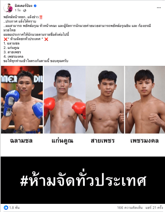 ทั้งนี้ สาเหตุของการสั่งห้ามครั้งนี้ยังไม่มีการเปิดเผยอย่างเป็นทางการในโพสต์ นอกจากนี้ยังได้แนบภาพนักมวยทั้ง 4 คน พร้อมข้อความ “#ห้ามจัดทั่วประเทศ” เพื่อยืนยันมาตรการที่เข้มงวดของหน่วยงานที่กำกับดูแล