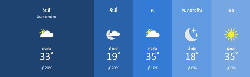 มีเมฆมากเป็นบางส่วน สูง 33เซลเซียส ความเร็วลม ใต้ ตะวันออกเฉียงใต้ ที่ 10 ถึง 15 กิโลเมตรต่อชั่วโมง