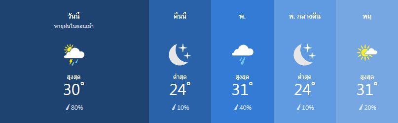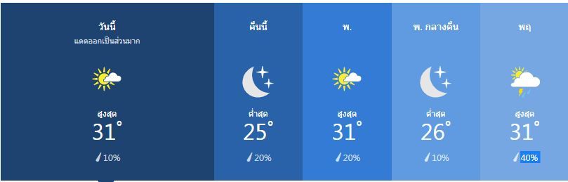 มีฝนโปรยตอนบ่าย สูง 31เซลเซียส ความเร็วลม ตะวันออก ที่ 15 ถึง 30 กิโลเมตรต่อชั่วโมง โอกาสที่ฝนจะตก 30%