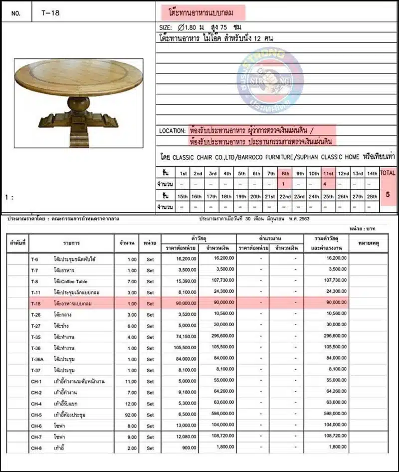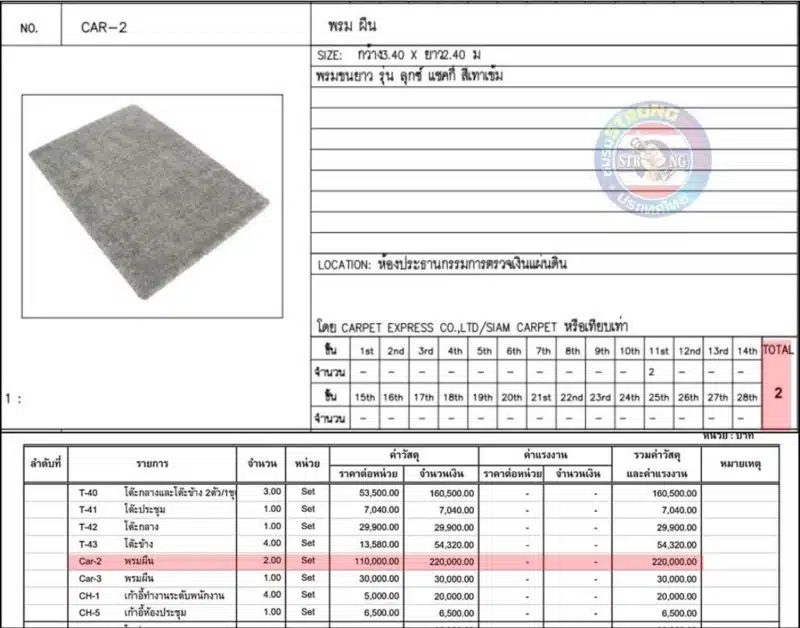 รวมถึงเอกสารอ้างเป็นตรวจราคาครุภัณฑ์ อาทิ พรมทอมือ Nylon ผืนละ 165,000 บาท โต๊ะกลมทานอาหารของผู้ว่าการ สตง.และประธาน คตง. ตัวละ 90,000 บาท ตามเอกสารจัดซื้อ 5 ตัว อีกทั้งพรมผืนละ 110,000 บาท