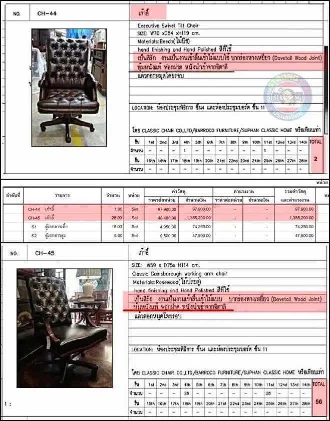 นอกจากนั้นยังมีเก้าอี้อีกชุด ระบุว่าจะถูกนำไปใช้ในห้องประชุมพิธีการชั้น 4 และห้องประชุมบอร์ดชั้น 11 โดยเป็นเก้าอี้ไม้ประดู่หุ้มหนังแท้ นำเข้าจากอิตาลี จำนวน 28 ตัว(ต่อห้อง) ราคาต่อหน่วย 48,400 บาท