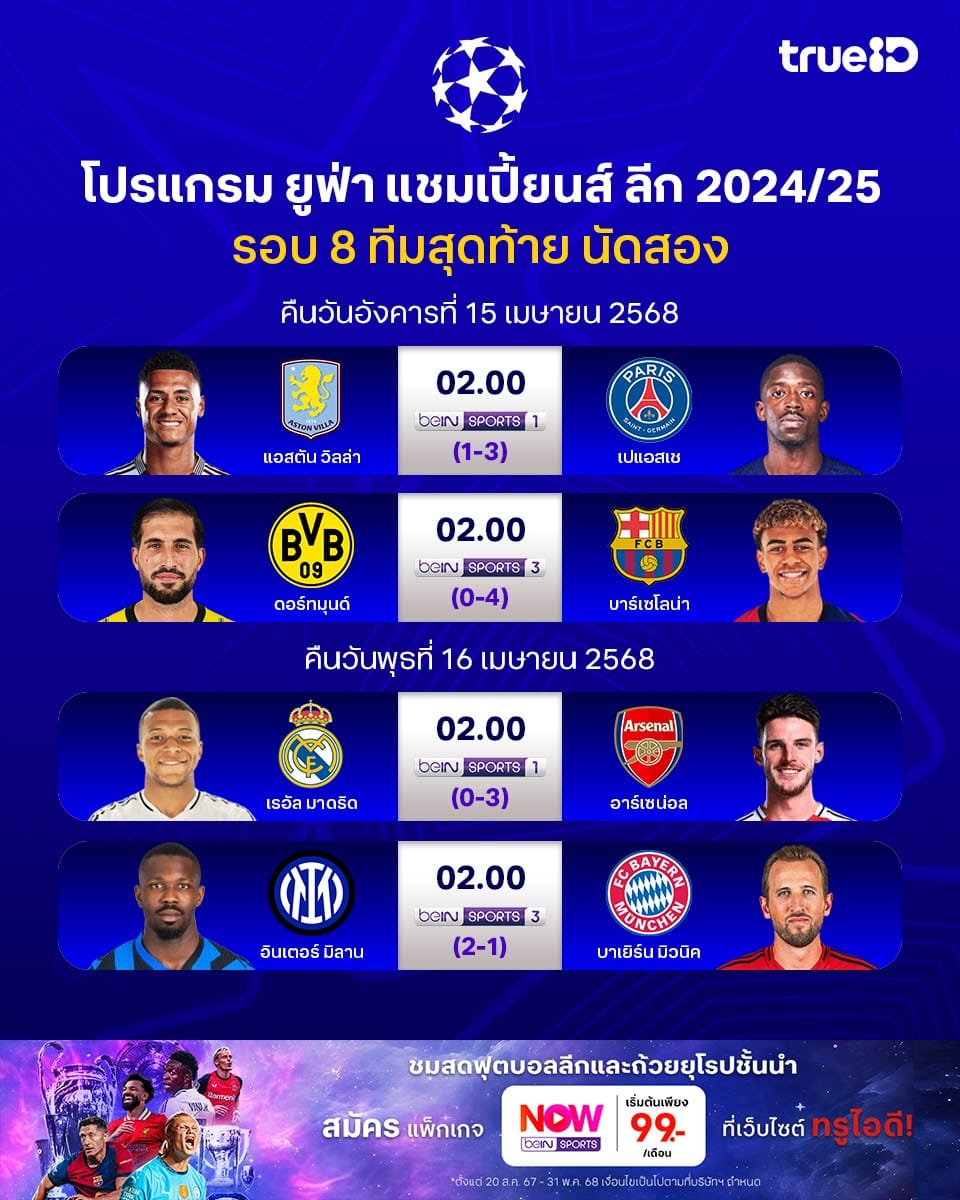 ยูฟ่า แชมเปี้ยนส์ ลีก รอบ 8 ทีมสุดท้าย นัดสอง ประจำฤดูกาล 2024/25 แข่งขันวันที่ 15-16 เมษายน 2568