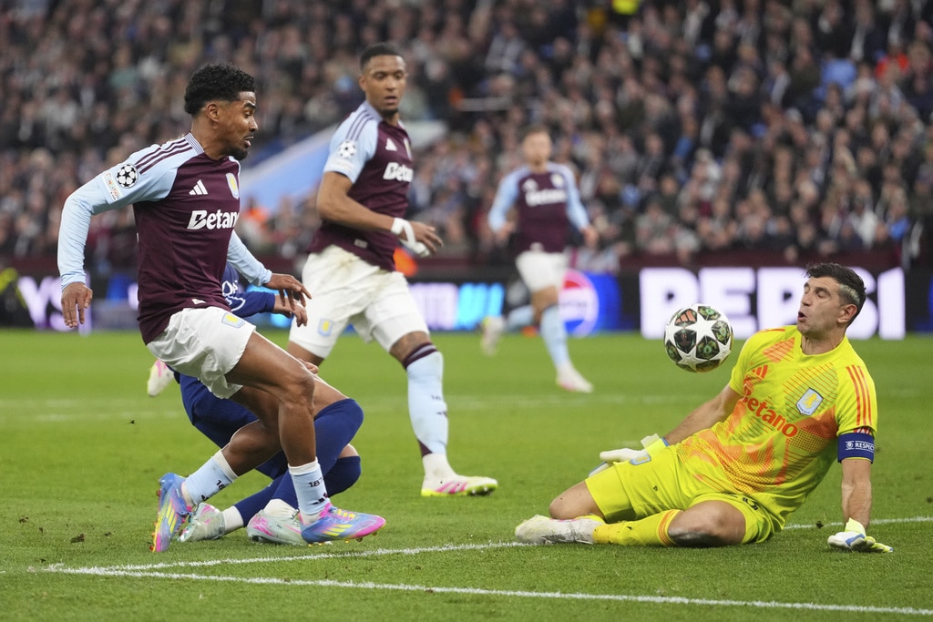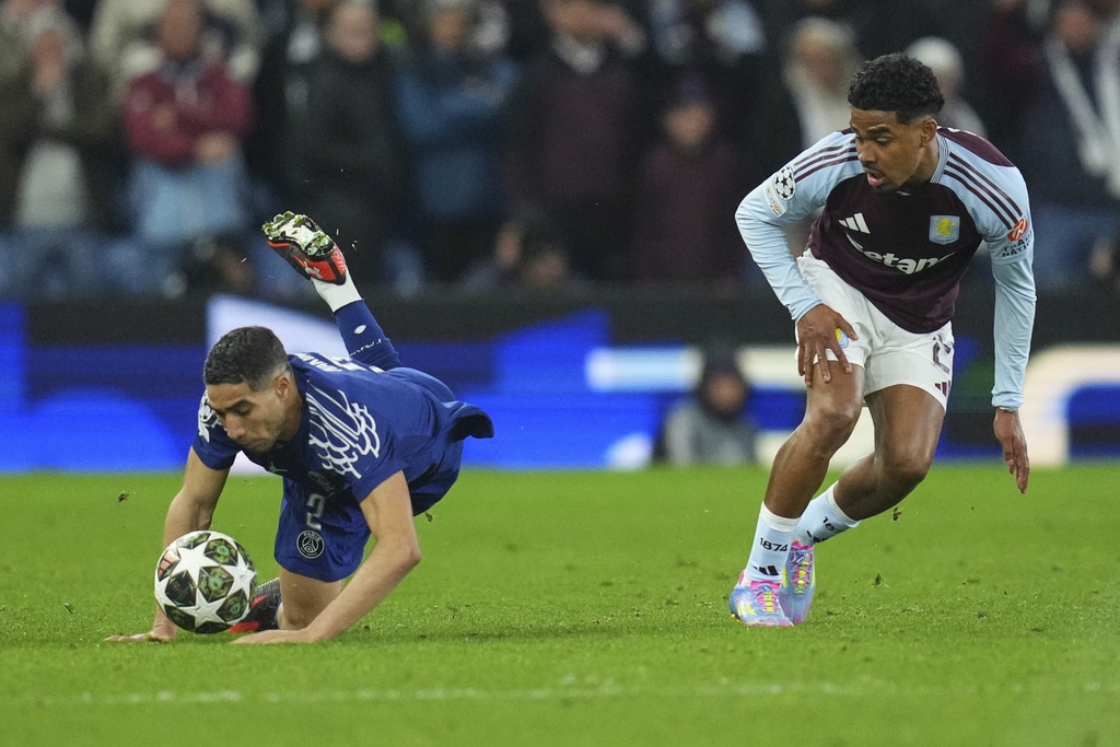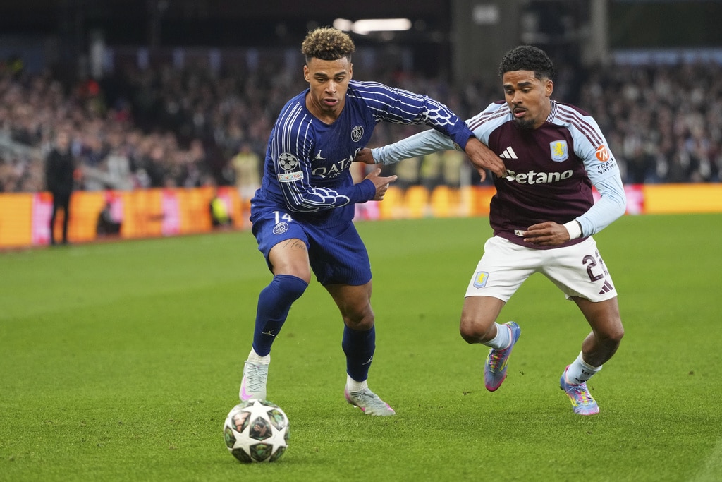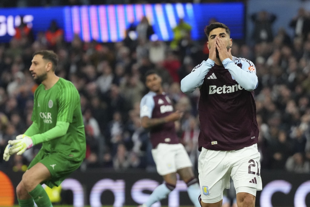 Aston Villa’s Marco Asensio reacts after failing to score during the Champions League quarterfinal second leg soccer match between Aston Villa and Paris Saint-Germain at the Villa Park stadium, in Birmingham, England, Tuesday, April 15, 2025. (AP Photo/Frank Augstein)PSG’s Marquinhos celebrates with PSG’s Willian Pacho at the end of the Champions League quarterfinal second leg soccer match between Aston Villa and Paris Saint-Germain at the Villa Park stadium, in Birmingham, England, Tuesday, April 15, 2025. (AP Photo/Frank Augstein)Aston Villa’s goalkeeper Emiliano Martinez, right, makes a save during the Champions League quarterfinal second leg soccer match between Aston Villa and Paris Saint-Germain at Villa Park stadium, Birmingham, England, Tuesday, April 15, 2025. (AP Photo/Kirsty Wigglesworth)PSG’s Achraf Hakimi, left, challenges for the ball with Aston Villa’s Ian Maatsen during the Champions League quarterfinal second leg soccer match between Aston Villa and Paris Saint-Germain at Villa Park stadium, Birmingham, England, Tuesday, April 15, 2025. (AP Photo/Kirsty Wigglesworth)PSG’s Desire Doue, left, challenges for the ball with Aston Villa’s Ian Maatsen during the Champions League quarterfinal second leg soccer match between Aston Villa and Paris Saint-Germain at Villa Park stadium, Birmingham, England, Tuesday, April 15, 2025. (AP Photo/Kirsty Wigglesworth)Referee Jose Maria Sanchez Martinez speaks to players during the Champions League quarterfinal second leg soccer match between Aston Villa and Paris Saint-Germain at the Villa Park stadium, in Birmingham, England, Tuesday, April 15, 2025. (AP Photo/Frank Augstein)