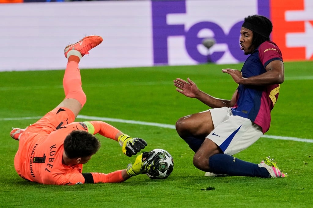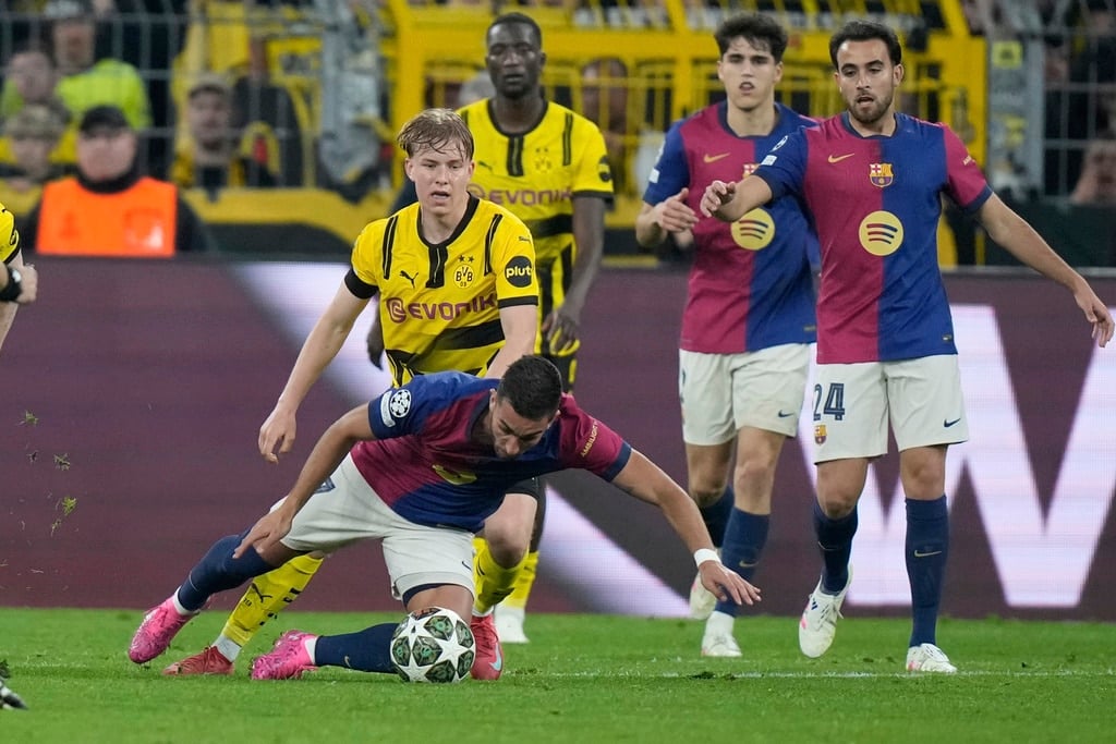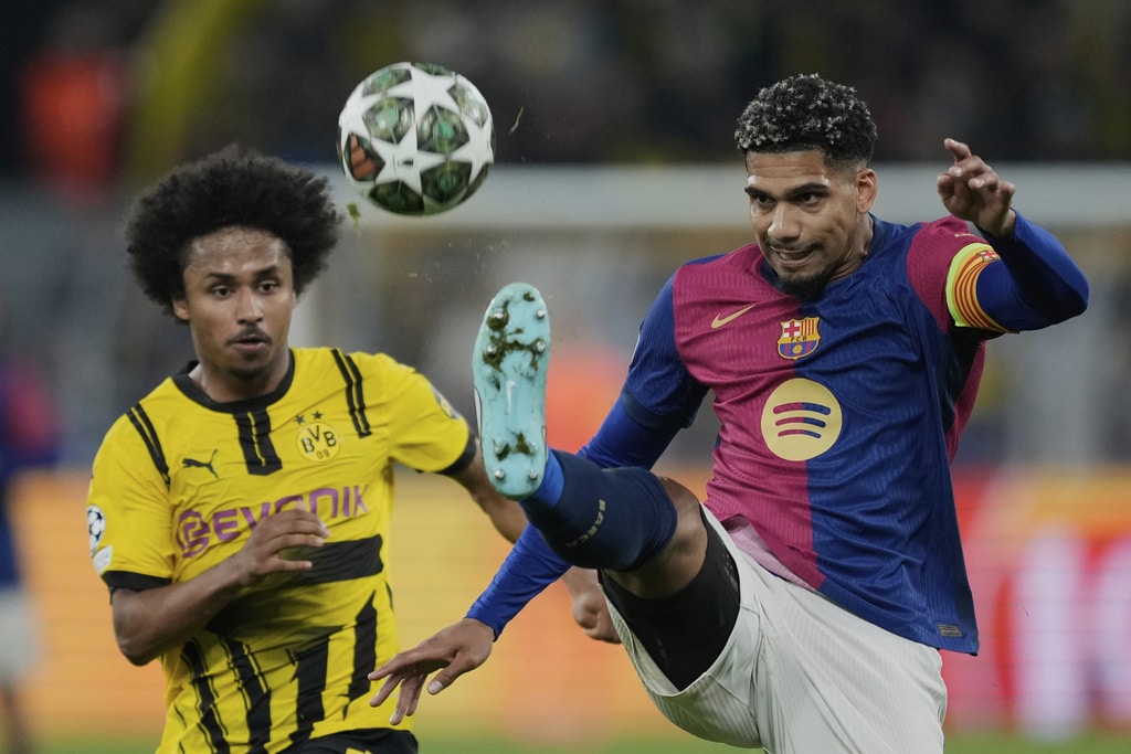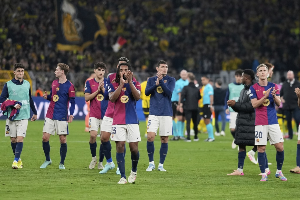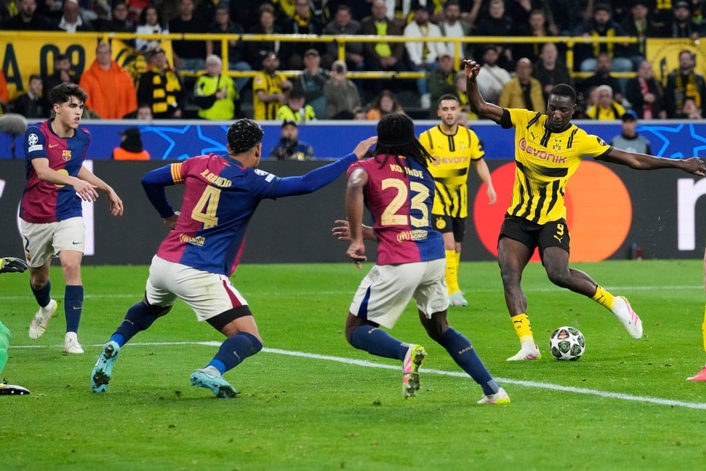 Barcelona’s Ronald Araujo, right, duels for the ball with Dortmund’s Karim Adeyemi during the Champions League quarterfinals second leg soccer match between Borussia Dortmund and Barcelona, at the Signa-Iduna Park in Dortmund, Germany, Tuesday, April 15, 2025. (AP Photo/Martin Meissner)Dortmund’s goalkeeper Gregor Kobel, left, makes a save in front of Barcelona’s Jules Kounde during the Champions League quarterfinals second leg soccer match between Borussia Dortmund and Barcelona, at the Signa-Iduna Park in Dortmund, Germany, Tuesday, April 15, 2025. (AP Photo/Martin Meissner)Barcelona players greet supporters at the end of the Champions League quarterfinals second leg soccer match between Borussia Dortmund and Barcelona, at the Signa-Iduna Park in Dortmund, Germany, Tuesday, April 15, 2025. (AP Photo/Matthias Schrader)Barcelona’s Ferran Torres, bottom, is challenged by Dortmund’s Daniel Svensson during the Champions League quarterfinals second leg soccer match between Borussia Dortmund and Barcelona, at the Signa-Iduna Park in Dortmund, Germany, Tuesday, April 15, 2025. (AP Photo/Matthias Schrader)Dortmund’s Serhou Guirassy, right, scores his side’s third goal during the Champions League quarterfinals second leg soccer match between Borussia Dortmund and Barcelona, at the Signa-Iduna Park in Dortmund, Germany, Tuesday, April 15, 2025. (AP Photo/Martin Meissner)