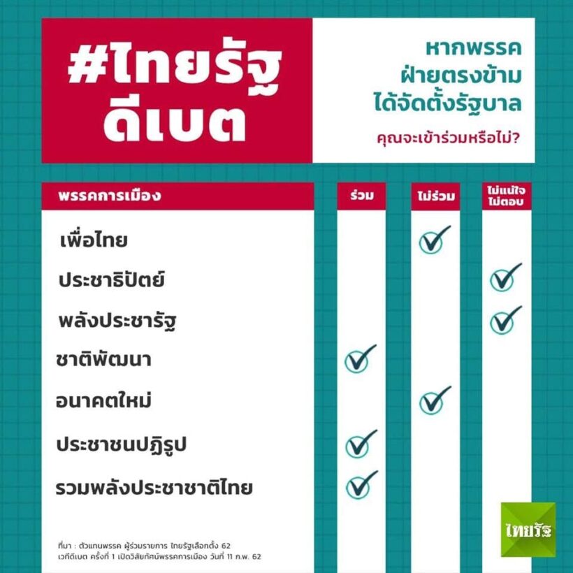 โดยการพูดคุยตอนหนึ่ง มีคำถามว่า หากพรรคฝ่ายตรงข้ามได้จัดตั้งรัฐบาล พรรคของตนจะเข้าร่วมหรือไม่ ซึ่งกระแสหลักในการเลือกตั้งครั้งนี้ เกิดขึ้นระหว่างการเลือกพรรคที่สนับสนุนพล.อ.ประยุทธ์ จันทร์โอชาให้กลับมาดำรงตำแหน่งนายกรัฐมนตรีอีกครั้ง กับพรรคที่มีจุดยืดหยุดการสืบทอดอำนาจของระบอบเผด็จการ คสช. ซึ่งคำตอบแต่ละพรรคได้แสดงจุดยืนดังต่อไปนี้