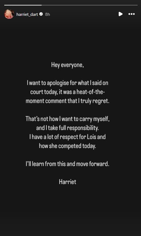 “มันไม่ใช่สิ่งที่ฉันควรจะแสดงออกมา และฉันขอยอมรับผิดอย่างเต็มที่ ฉันเคารพตัวของ โลอิส มาก และการแข่งขันของเธอในวันนี้”