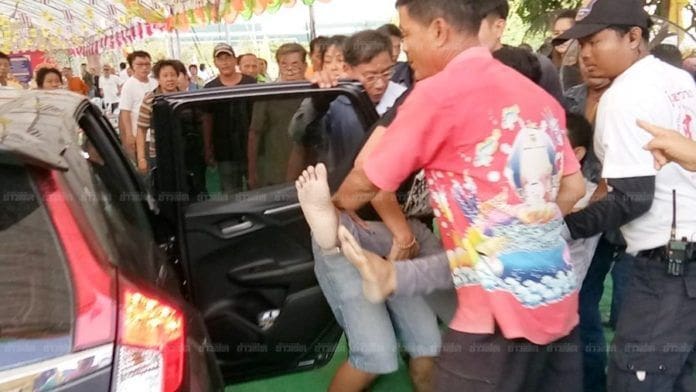 วันที่ 11 ก.พ. เกิดเหตุยิงกันภายในอุโบสถ งานปิดทองฝังลูกนิมิต วัดมงคลสวัสดิ์ หรือ วัดเม้าสุขขา ต.หนองซ้ำซาก อ.บ้านบึง จ.ชลบุรี มีผู้ได้รับบาดเจ็บหลายราย ที่เกิดเหตุพบร่าง นายนิกร อายุ 31 ปี ถูกยิงหน้าท้อง กระสุนทะลุหลังเสียเลือดมากอาการสาหัส นั่งเอามือกุมแผลหน้าซีด และ พระมหาประภาส พลศรี อายุ 53 ปี ถูกยิงเข้าข้อมือขวา ส่วนมือปืนคือ นายภาคิน นันทชลากรกิจ อายุ 26 ปี ถูกจับพร้อมอาวุธปืนขนาด 9 ม.ม. และกระสุนอีก 10 นัด