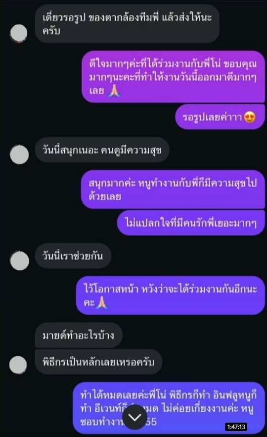 มายด์ ตอบกลับไปว่า “ดีใจมาก ๆ ค่ะที่ได้ร่วมงานกับพี่โน่ ขอบคุณมาก ๆ นะคะที่ทำให้งานวันนี้ออกมาดีมาก ๆ เลย รอรูปเลยค่าาา สนุกมากค่ะ หนูทำงานกับพี่ก็มีความสุขไปด้วยเลย ไม่แปลกใจที่มีคนรักพี่เยอะมาก ๆ ไว้โอกาสหน้าหวังว่าจะได้ร่วมงานกันอีกนะคะ”