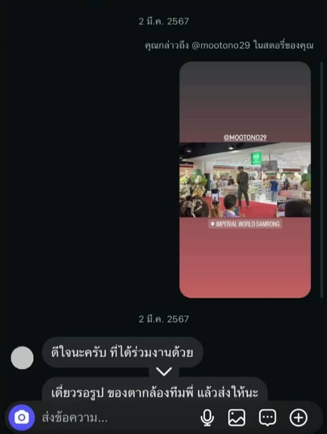 คลิปโตโน่ในงานอีเวนต์หนึ่ง เมื่อวันที่ 2 มีนาคม 2567 ทางฝั่งของมายด์ถ่ายลงสตอรี่ไอจี และแท็กชื่อไปยังไอจีของนักร้องดัง ต่อมาหลังจบงานโตโน่เป็นคนทักมาในแชตไอจีของมายด์ก่อนด้วยตัวเอง ระบุว่า “ดีใจนะครับ ที่ได้ร่วมงานด้วย เดี๋ยวรอรูปของตากล้องทีมพี่ แล้วส่งให้นะ…วันนี้สนุกเนอะ คนดูมีความสุข”