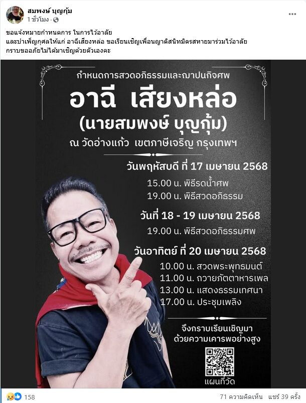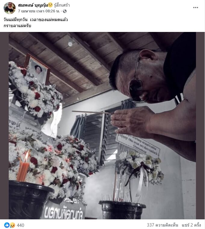 ล่าสุด เรื่องราวที่ทำให้หลายคนยิ่งสะเทือนใจมากขึ้นไปอีก คือการเปิดเผย โพสต์สุดท้าย บนเฟซบุ๊กส่วนตัวของ อาฉี เสียงหล่อ (เฟซบุ๊ก: อาฉี ตลกดัง สมพงษ์ บุญกุ้ม) ซึ่งเพิ่งโพสต์ไว้เมื่อวันที่ 7 เมษายน 2568 ที่ผ่านมา หรือเพียงประมาณ 9 วันก่อนที่ท่านจะเสียชีวิต โดยโพสต์ดังกล่าวเป็นภาพขณะ อาฉี กำลังก้มลงกราบลาคุณแม่ที่เพิ่งจากไป พร้อมแคปชั่นสุดเศร้าว่า “วันแม่มีทุกวัน เวลาของแม่หมดแล้ว กราบลาแม่ครับ”