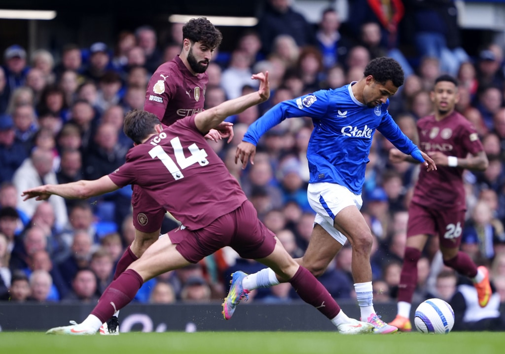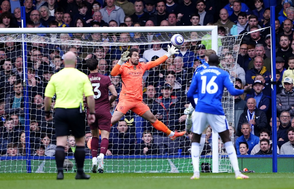 Manchester City goalkeeper Stefan Ortega saves a shot from Everton’s Jarrad Branthwaite during the English Premier League soccer match between Everton and Manchester City at Goodison Park, Liverpool, England, Saturday April 19, 2025. (Peter Byrne/PA via AP)Manchester City’s Matheus Nunes, left, and Everton’s Vitaliy Mykolenko battle for the ball during the English Premier League soccer match between Everton and Manchester City at Goodison Park, Liverpool, England, Saturday April 19, 2025. (Peter Byrne/PA via AP)Everton’s Iliman Ndiaye, left, and Manchester City’s Bernardo Silva battle for the ball during the English Premier League soccer match between Everton and Manchester City at Goodison Park, Liverpool, England, Saturday April 19, 2025. (Peter Byrne/PA via AP)Manchester City’s Nico Gonzalez and Everton’s Iliman Ndiaye, right, battle for the ball during the English Premier League soccer match between Everton and Manchester City at Goodison Park, Liverpool, England, Saturday April 19, 2025. (Peter Byrne/PA via AP)