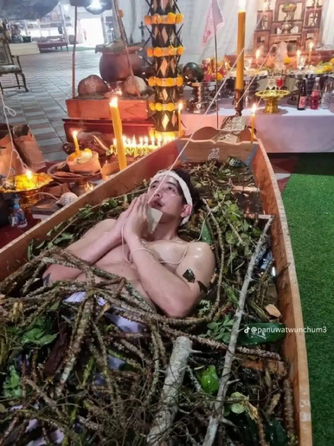 คำพูดดังกล่าว ทำให้ชาวเน็ตขุดกลับไปถึงพิธีกรรม “แช่น้ำว่าน 108” ที่โตโน่เคยเข้าร่วมเมื่อปีก่อน ณ สำนักเขาอ้อ จ.พัทลุง ซึ่งเป็นพิธีโบราณที่เชื่อกันว่าเสริมอาคมด้านคงกระพันชาตรี