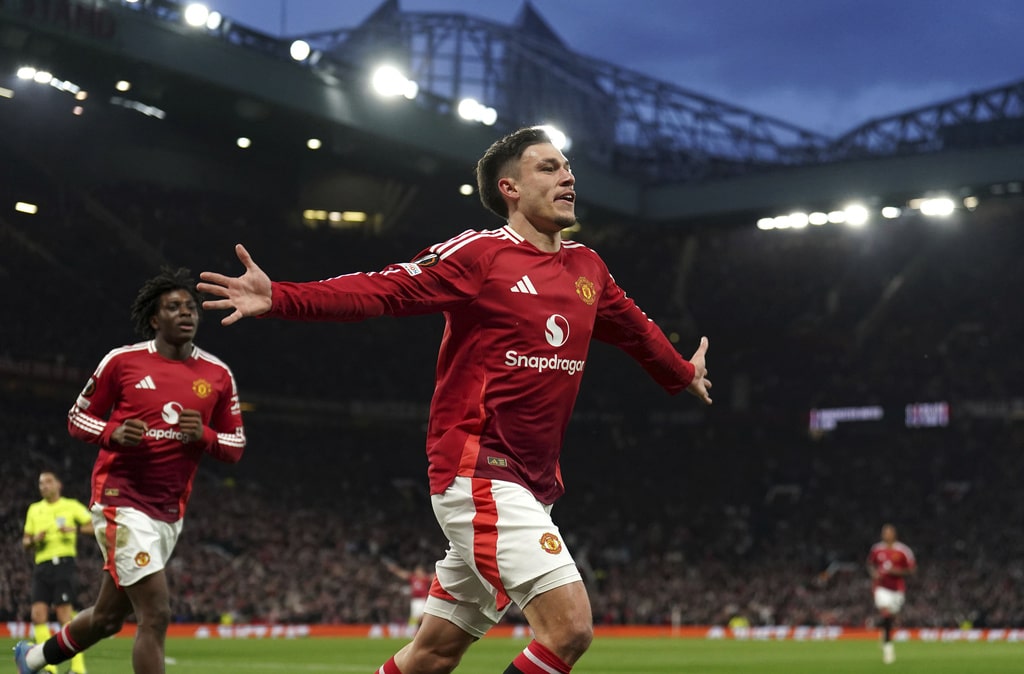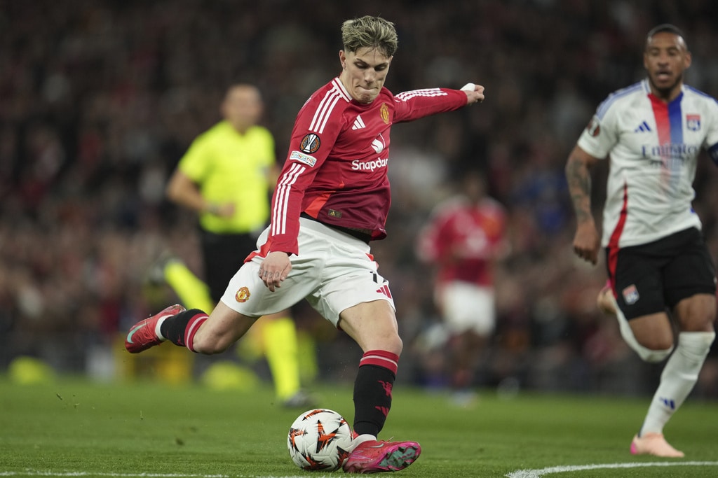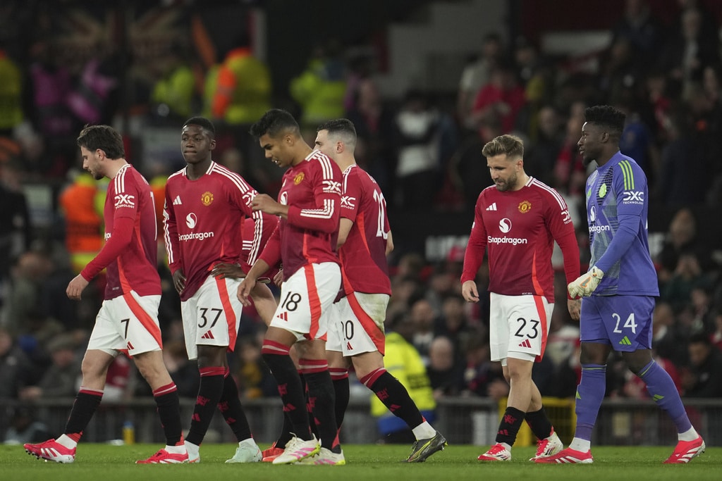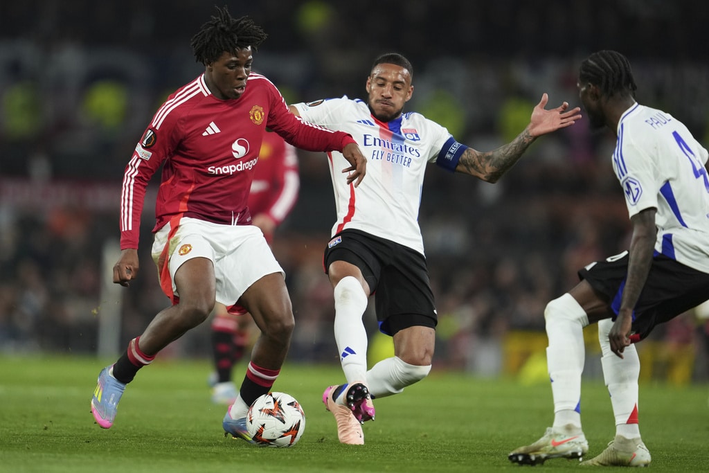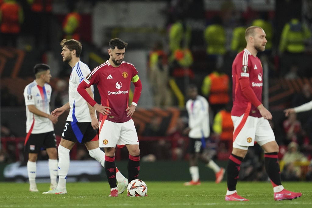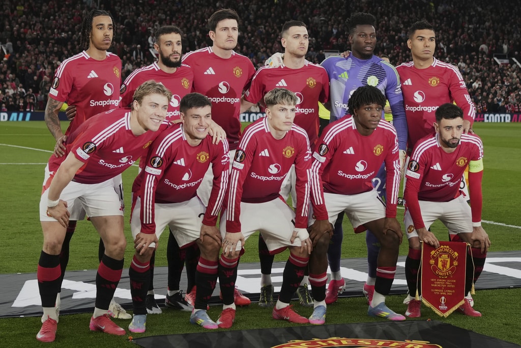 Manchester United pose prior to the Europa League quarter final second leg soccer match between Manchester United and Olympique Lyon in Manchester, Britain, Thursday, April 17, 2025. (AP Photo/Jon Super)Manchester United’s Bruno Fernandes reacts after Lyon’s Alexandre Lacazette scored during the Europa League quarter final second leg soccer match between Manchester United and Olympique Lyon in Manchester, Britain, Thursday, April 17, 2025. (AP Photo/Jon Super)Manchester United players react after the regular match time during the Europa League quarter final second leg soccer match between Manchester United and Olympique Lyon in Manchester, Britain, Thursday, April 17, 2025. (AP Photo/Jon Super)Manchester United’s Alejandro Garnacho shoots during the Europa League quarter final second leg soccer match between Manchester United and Olympique Lyon in Manchester, Britain, Thursday, April 17, 2025. (AP Photo/Jon Super)Manchester United’s Luke Shaw, left, and Lyon’s Corentin Tolisso challenge for the ball during the Europa League quarter final second leg soccer match between Manchester United and Olympique Lyon in Manchester, Britain, Thursday, April 17, 2025. (AP Photo/Jon Super)Manchester United’s Diogo Dalot celebrates scoring during the Europa League quarterfinal second leg soccer match between Manchester United and Olympique Lyon in Manchester, England, Thursday, April 17, 2025. (Martin Rickett/PA via AP)Manchester United’s Manuel Ugarte, right, celebrates after scoring his side’s opening goal during the Europa League quarter final second leg soccer match between Manchester United and Olympique Lyon in Manchester, Britain, Thursday, April 17, 2025. (AP Photo/Jon Super)Manchester United’s Manuel Ugarte celebrates after scoring his side’s opening goal during the Europa League quarter final second leg soccer match between Manchester United and Olympique Lyon in Manchester, England, Thursday, April 17, 2025. (Martin Rickett/PA via AP)