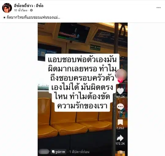 เมื่อกลางดึกวันที่ 18 เมษายน 2568 เพจเฟซบุ๊กของ อีซ้อขยี้ข่าว : อีซ้อ ได้ออกมาโพสต์ภาพที่แคปมาจากหน้าช่องติ๊กต็อกของผู้ใช้รายหนึ่ง คาดเป็นเด็กสาววัยรุ่น โพสต์ภาพที่มีข้อความเขียนเอาไว้ว่า “แอบชอบพ่อตัวเองมันผิดมากเลยหรอ ทำไมถึงชอบครอบครัวตัวเองไม่ได้ มันผิดตรงไหน ทำไมต้องขัดความรักของเรา” โดยอีซ้อได้ระบุแคปชั่นสั้น ๆ ประกอบเอาไว้ด้วยว่า “ผิดมากไหมที่แอบชอบแฟนของแม่…”
