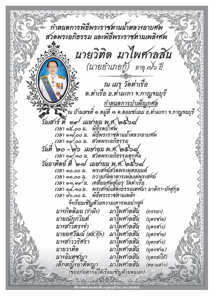กำหนดการพิธีพระราชทานน้ำหลวงอาบศพ นายวิทิต มาไพศาลสิน (นายอำเภอกู้)
