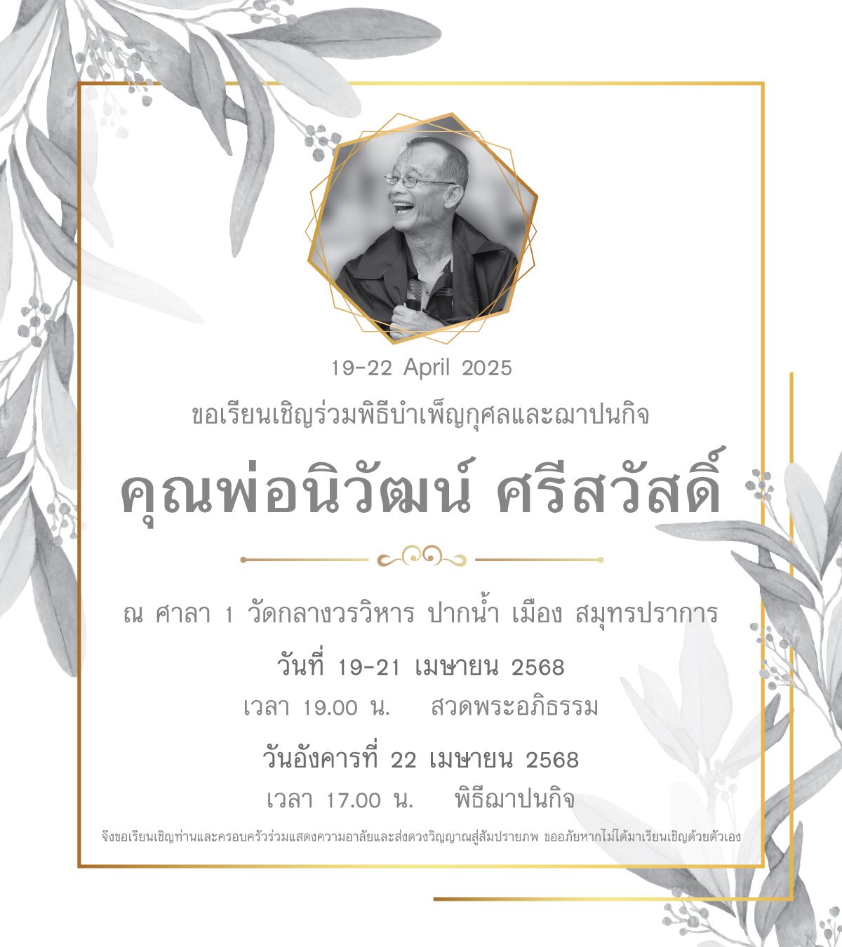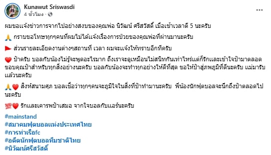 “ผมขอเเจ้งข่าวการจากไปอย่างสงบของคุณพ่อ นิวัฒน์ ศรีสวัสดิ์ เมื่อเช้าเวลาตี 5 นะครับ
