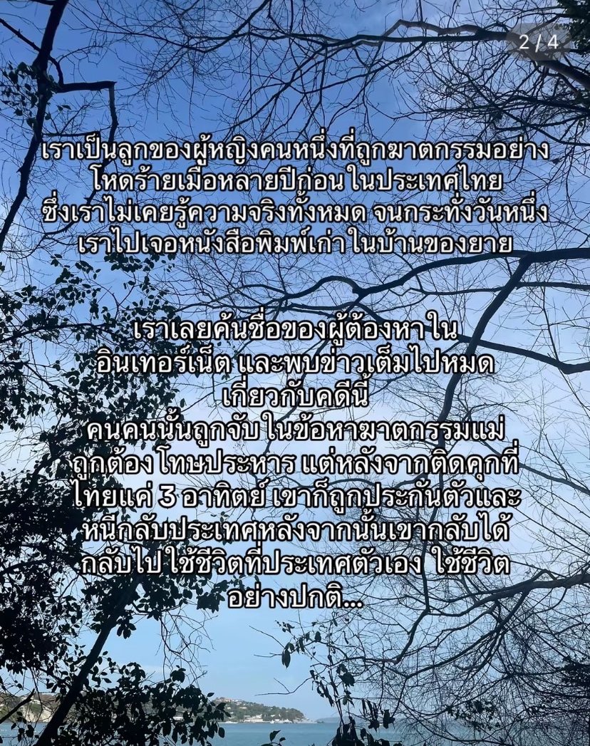 ลูกสาวโพสต์ ทวงคืนความยุติธรรม แม่ถูกอดีตสามีชาวเบลเยียม ฆาตกรรม เมื่อ 20 ปีก่อน คนร้ายหนีออกนอกประเทศ พ้นผิดคดีในไทย? ใช้ชีวิตสุขสบายท่ามกลางความทุกข์ของครอบครัวเหยื่อ