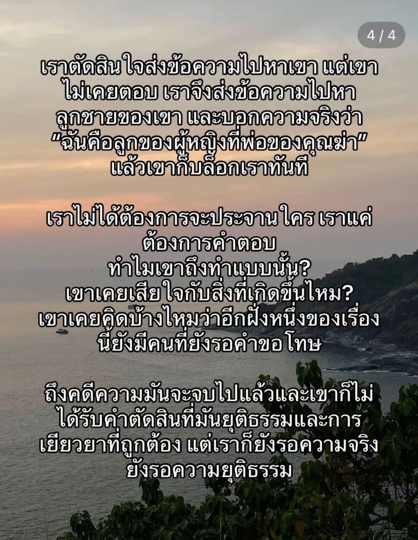 ทางเจ้าของช่องซึ่งเป็นลูกสาวของผู้เสียชีวิตได้พยายามทวงคืนความยุติธรรมให้กับครอบครัวด้วยตัวเองมาตลอด โดยทำการติดต่อไปยังลูกชายของอดีตสามีแม่ผู้ที่ลงมือฆ่า แต่กลับถูกบล็อคการติดต่อทั้งหมด และไม่มีแม้กะทั้งคำขอโทษ แถมยังใช้ชีวิตกินหรู อยู่สบาย เที่ยวรอบโลกแบบสุขสันต์ ท่ามกลางความเจ็บช้ำและความสูญเสียของครอบครัวหญิงไทย ที่ตกเป็นเหยื่อของฆาตกรรายนี้