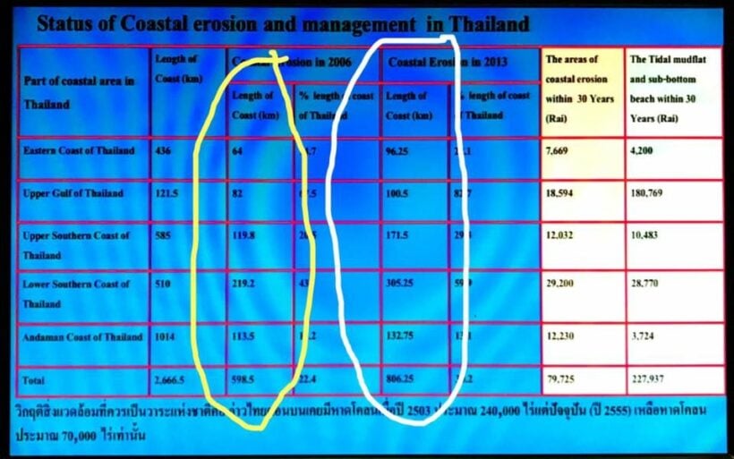 ผมนำตารางเปรียบเทียบข้อมูลมาให้ดูชัดๆ วงสีเหลืองคือชายฝั่งที่โดนกัดเซาะปี 06 วงสีขาวคือปี 13 จะเห็นได้ว่ายิ่งสร้างยิ่งโดนกัดเซาะ และปัจจุบัน ปัญหาไม่ได้ลดลงเลย (ตารางจากศ.ดร.ธนวัฒน์ครับ)