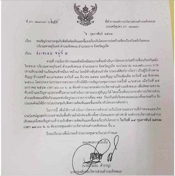 วันที่ 13 ก.พ. ผู้สื่อข่าวได้รับรายงาน องค์การบริหารส่วนตำบลเชิงทะเล อ.ถลาง จ.ภูเก็ต ออกหนังสือเชิญชาวบ้านร่วมประชุมและแสดงความคิดเห็นกรณี กรมโยธาธิการและผังเมืองมีแผนงานดำเนินการสร้างเขื่อนป้องกันตลิ่งริมทะเล บริเวณหาดสุรินทร์ ต.เชิงทะเล อ.ถลาง จ.ภูเก็ต ตามสัญญาลงวันที่ 31 มี.ค. 2559 และสัญญาเพิ่มเติม ลงวันที่ 15 ส.ค. 2560 และมีการประชุมกรรมการครั้งที่ 1/2562 เมื่อวงันที่ 25 ม.ค. ที่ผ่านมาแล้วนั้น โดยเบื้องต้น นายกอบต.มีความกังวลใจและห่วงใยรูปแบบรายการเขื่อน ป้องกันตลิ่งข้างต้น จึงจัดการประชุมฟังความคิดเห็นชาวบ้าน ในวันพรุ่งนี้ (14 ก.พ. 2562)
