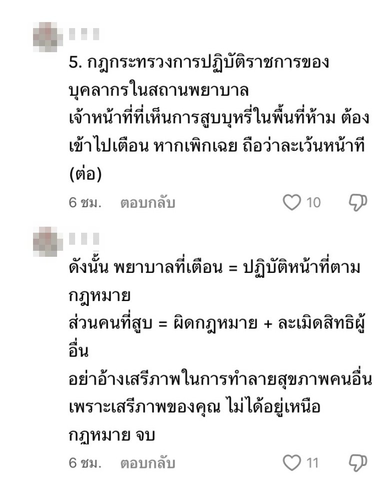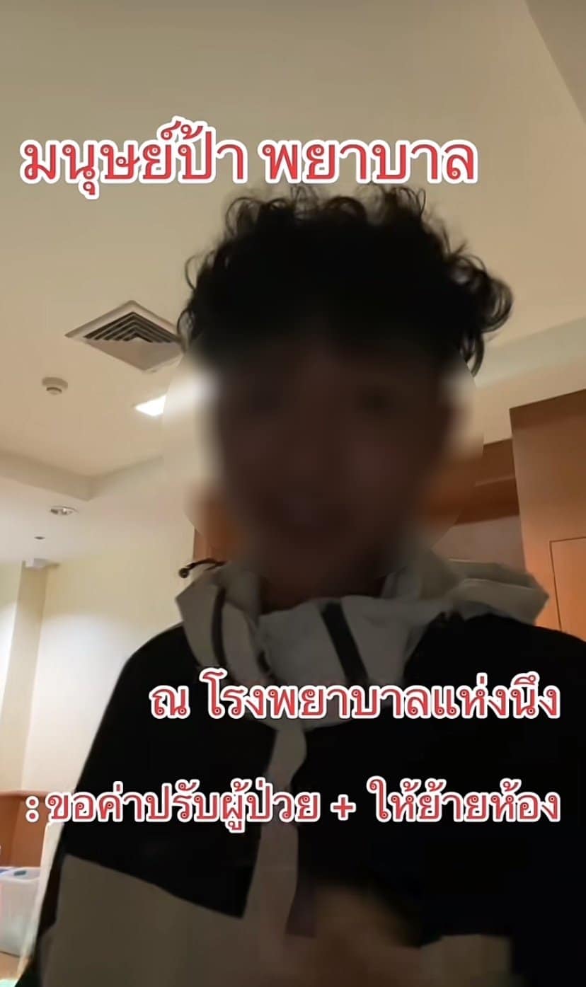 หลังจากนั้นตนจึงเดินกลับเข้าไปให้ห้องผู้ป่วย และคิดว่าจะออกไปยืนสูบบุหรี่ที่นอกระเบียงห้องของตัวเอง แต่พยาบาลคนเดิมเดินเข้ามาในห้องพอดีและเปิดผ้าม่านตรงเบียงดู ก็เห็นตนกำลังยืนถือบุหรี่กับไฟแช็กเตรียมไว้ พยาบาลคนดังกล่าวต่อว่าออกมาว่า ‘ทำอะไรไม่เคารพสถานที่ เดี๋ยวจะให้จ่ายค่าปรับ’ พร้อมถามถึงญาติที่มาเฝ้าไข้ทำไมไม่อยู่ในห้องด้วย ถ้าไม่มีคนเฝ้าจะต้องย้ายไปที่ตึกผู้ป่วยธรรมดา ซึ่งหนุ่มเจ้าของคลิปเองก็เผยว่า ตนไม่โอเคที่จะจับย้ายห้อง ถ้าไม่มีญาติเฝ้าตลอด แถมที่บอกจะปรับเรื่องสูบบุหรี่ก็ไม่รู้ว่าเอาเงินเข้ากระเป๋าตัวเองหรือเปล่า