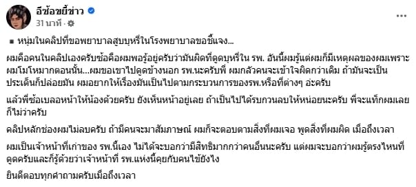 ล่าสุดหนุ่มเจ้าของคลิปก็ได้ติดต่อไปหาเพจ อีซ้อขยี้ข่าว เพื่อชี้แจงเรื่องราวที่เกิดขึ้นเบื้องต้น โดยอีซ้อก็ได้นำมาอัปเดตให้ชาวเน็ตได้ทราบพร้อมกันที่หน้าเพจเฟซบุ๊ก ระบุว่า “หนุ่มในคลิปที่ขอพยาบาลสูบบุหรี่ในโรงพยาบาลขอชี้แจง… ผมคือคนในคลิปเองครับซ้อคือผมพอรู้อยู่ครับว่ามันผิดที่ดูดบุหรี่ใน รพ. อันนี้ผมรู้แต่ผมก็มีเหตุผลของผมเพราะผมโมโหมากตอนนั้น…ผมขอเขาไปดูดข้างนอก รพ.นะครับพี่ ผมกลัวคนจะเข้าใจผิดกว่าเดิม ถ้ามันจะเป็นประเด็นก็ปล่อยมัน ผมอยากให้เรื่องมันเป็นไปตามกระบวนการของรพ.หรือที่ต่าง ๆ อ่ะครับ แล้วพี่ซ้อเบลอหน้าให้น้องด้วยครับ ยังเห็นหน้าอยู่เลย ถ้าเป็นไปได้รบกวนลบให้หน่อยนะครับ พี่จะแท็กผมเลยก็ไม่ว่าครับ คลิปหลักช่องผมไม่ลบครับ ถ้ามีคนจะมาสัมภาษณ์ ผมก็จะตอบตามสิ่งที่ผมเจอ พูดสิ่งที่ผมผิด เมื่อถึงเวลา ผมเป็นเจ้าหน้าที่เก่าของ รพ.นี้เอง ไม่ได้จะบอกว่ามีสิทธิมากกว่าคนอื่นนะครับ แต่ผมจะบอกว่าผมรู้ตรงไหนที่ดูดครับและก็รู้ด้วยว่าเจ้าหน้าที่ รพ.แห่งนี้คุยกับคนไข้ยังไง ยินดีตอบทุกคำถามครับเมื่อถึงเวลา”