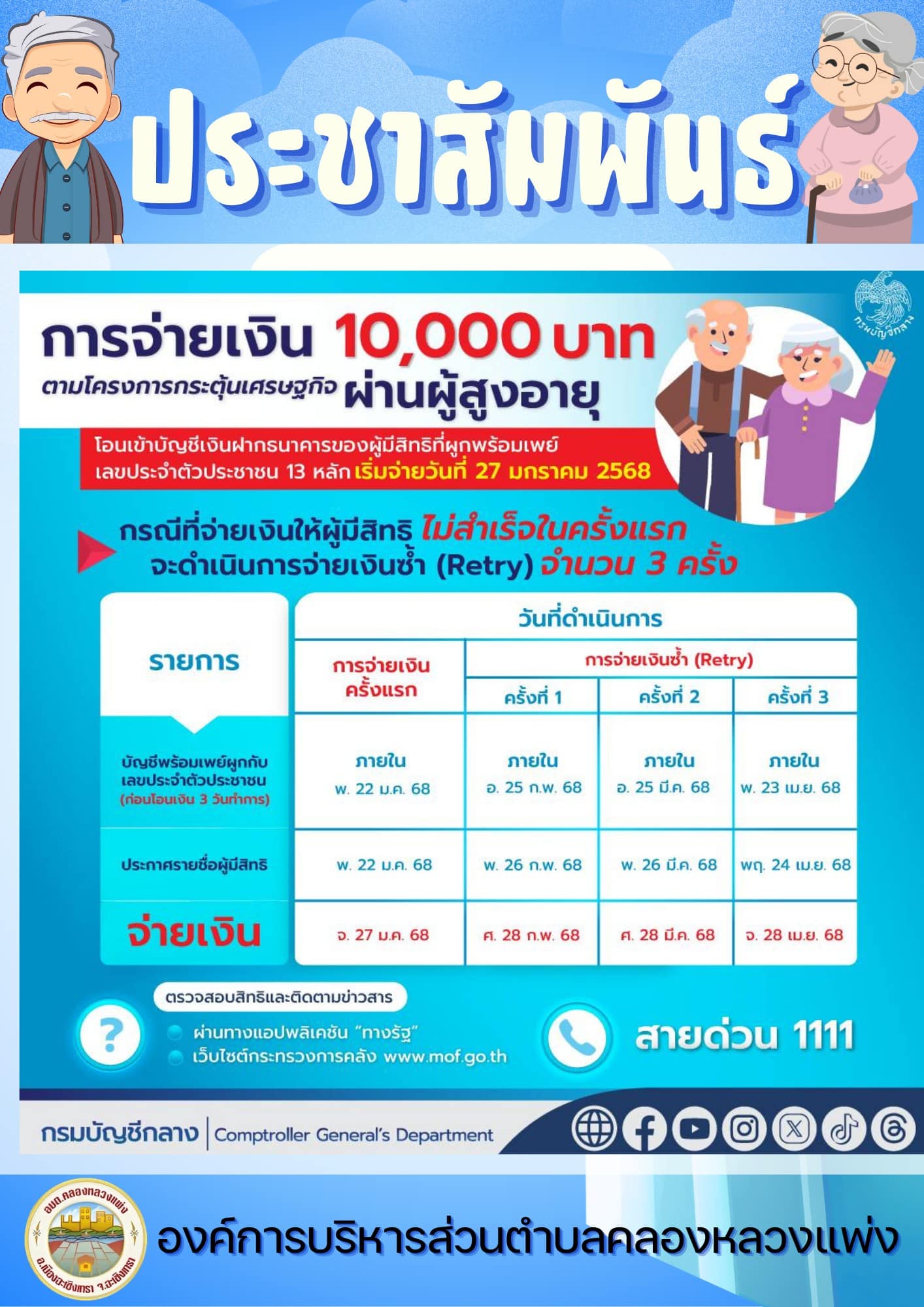 - การจ่ายเงินซ้ำครั้งที่ 2 : ผูกพร้อมเพย์กับเลขบัตรประชาชน ภายในวันที่ 25 มีนาคม 2568 รับเงินในวันที่ 28 มีนาคม 2568