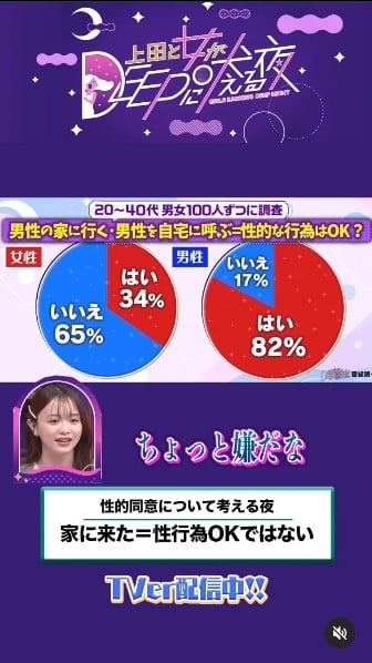รายการทีวีดังของญี่ปุ่น ได้ทำโพลสำรวจหัวข้อ “ถ้าผู้หญิงไปบ้านผู้ชาย หรือ ผู้ชายเรียกไปหาที่บ้าน ถือว่าผู้หญิงยินยอมมีเซ็กซ์ หรือไม่?” ผลออกมาสุดพีก