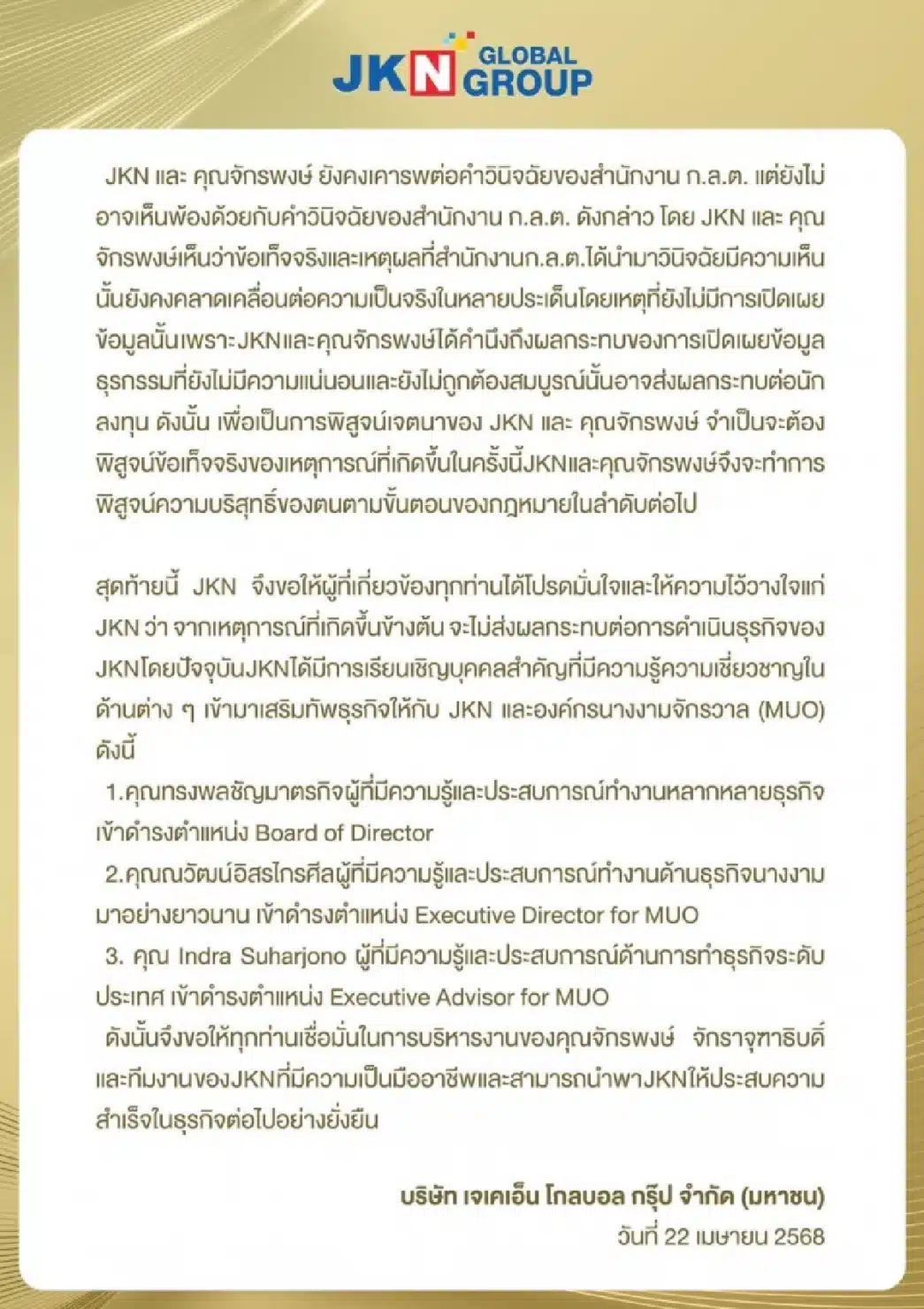 พร้อมกันนี้ JKN และ “แอน จักรพงษ์” เตรียมดำเนินการพิสูจน์ความบริสุทธิ์ของตนตามขั้นตอนกฎหมายต่อไป