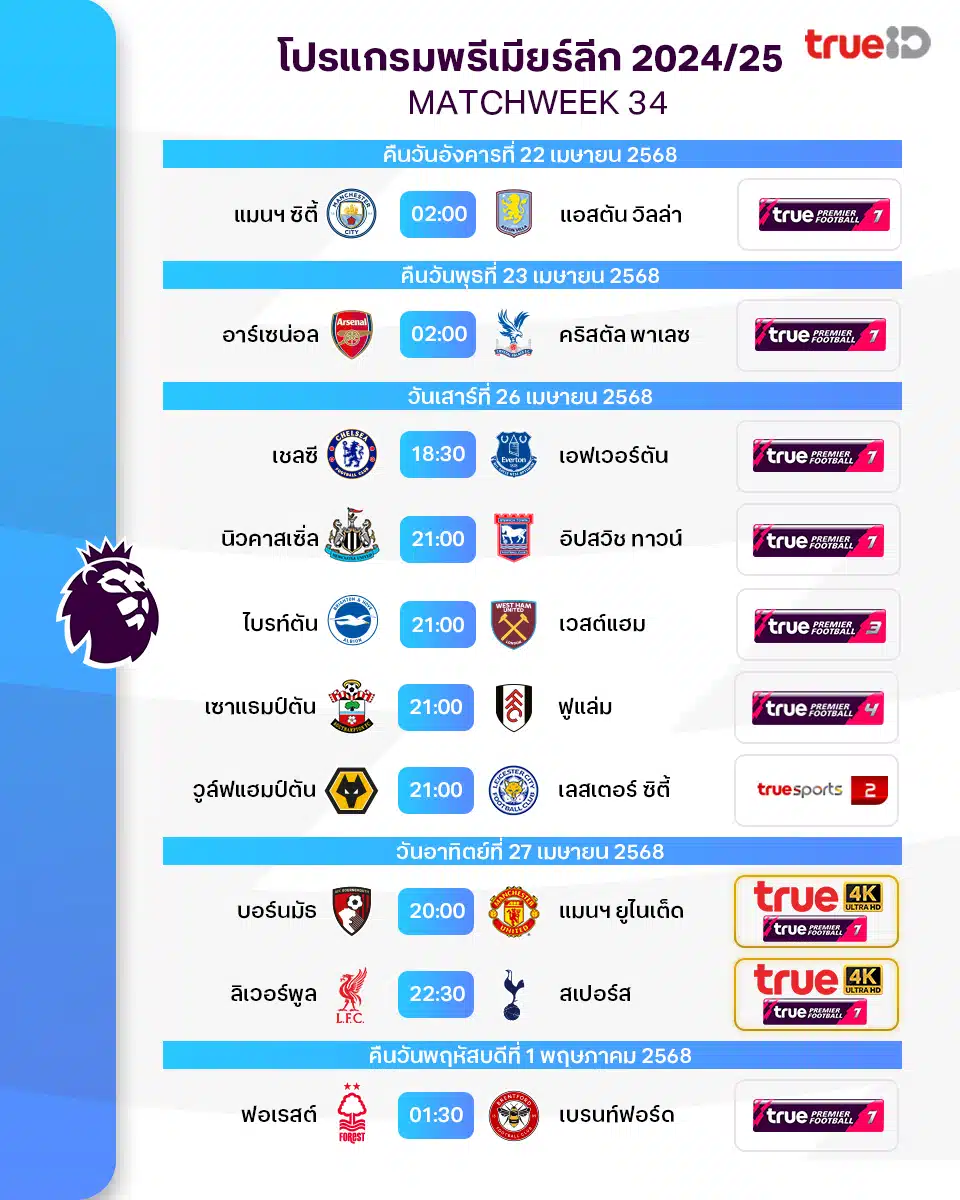 โปรแกรม พรีเมียร์ลีก ประจำฤดูกาล 2024/25 สัปดาห์ที่ 34 ของฤดูกาล