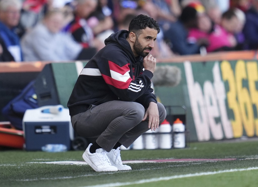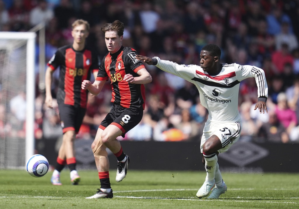 Bournemouth’s Antoine Semenyo, right, celebrates after scoring the opening goal during the English Premier League match at Vitality Stadium, Bournemouth, England, Sunday, April 27, 2025. (Adam Davy/PA via AP)Bournemouth’s Alex Scott, left, and Manchester United’s Kobbie Mainoo battle for the ball during the English Premier League match at Vitality Stadium, Bournemouth, England, Sunday, April 27, 2025. (Adam Davy/PA via AP)Manchester United’s Bruno Fernandes, right, and Bournemouth’s Adam Smith battle for the ball during the English Premier League match at Vitality Stadium, Bournemouth, England, Sunday, April 27, 2025. (Adam Davy/PA via AP)Bournemouth’s Alex Scott (left) and Manchester United’s Kobbie Mainoo battle for the ball during the English Premier League soccer match between Bournemouth and Manchester United at Vitality Stadium, Bournemouth, England, Sunday April 27, 2025. (Adam Davy/PA via AP)Manchester United manager Ruben Amorim reacts during the English Premier League match at Vitality Stadium, Bournemouth, England, Sunday, April 27, 2025. (Adam Davy/PA via AP)