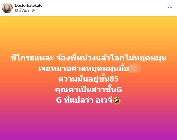 หมอของขวัญ ได้ออกมาโพสต์แสดงความคิดเห็นอย่างดุเดือดผ่านเฟซบุ๊ก Doctorkatekate พุ่งเป้าไปที่คู่กรณีของ หนุ่ม กรรชัย แบบตรง ๆ พร้อมข้อความว่า “ชีโกรธแหละ จ้องพี่หน่วงแล้วโลกไม่หยุดหมุน เจอหมายศาลหยุดหมุนมั้ย ความมั่นอยู่ชั้น 85 คุณค่าเป็นสาวชั้น G G ที่แปลว่า อเวจี”