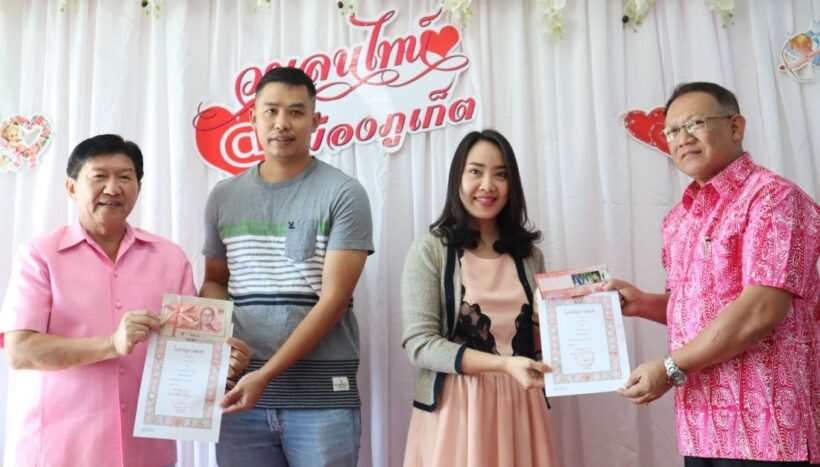 ทั้งนี้ นาย ประกอบ วงศ์มณีรุ่ง รองผู้ว่าราชการจังหวัดภูเก็ต เดินทางมาเป็นประธานมอบทะเบียนสมรส และรางวัลให้แก่คู่รักหนุ่มสาว โดยมี ว่าที่ร้อยตรี วิกรม จากที่ นายอำเภอเมืองภูเก็ต นาย สุธี ศิริอนันต์ ปลัดอำเภอเมืองภูเก็ต ร่วมเป็นสักขีพยาน