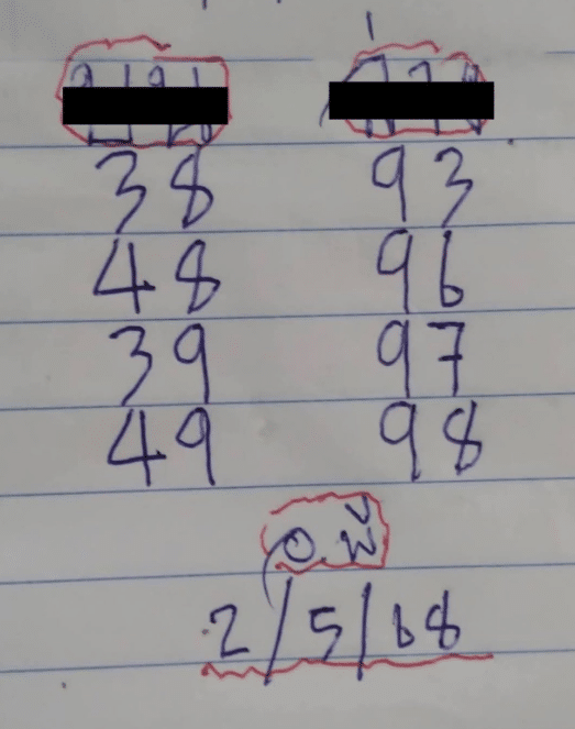 - เลขท้ายสองตัว : 38 – 48 – 39 – 49 – 93 – 96 – 97 – 98