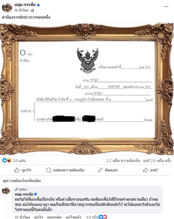 เรียกว่าเป็นประเด็นที่ยังคงร้อนระอุและมีรายละเอียดให้ติดตามแทบไม่เว้นวัน หลังจากที่พิธีกรคนดัง ‘หนุ่ม กรรชัย กำเนิดพลอย’ ได้โพสต์ภาพเอกสารลักษณะคล้ายคำฟ้องลงเฟซบุ๊กส่วนตัว หนุ่ม กรรชัย ส่งสัญญาณชัดเจนว่าเตรียมเดินหน้าดำเนินการทางกฎหมายกับ ‘เบียร์ เดอะวอยซ์’ หรือ ‘เบียร์ ภัสรนันท์ อัษฎมงคล’ คู่กรณี ปมล้ำเส้น-ถูกบิดเบือนข้อเท็จจริง