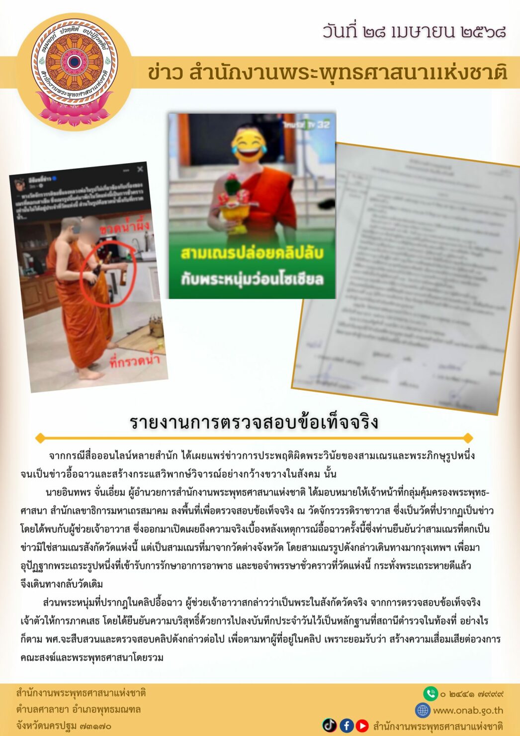 ล่าสุดเพจเฟซบุ๊ก สำนักงานพระพุทธศาสนาแห่งชาติ (พศ.) เผยแพร่เอกสารข่าวชี้แจงกรณีดังกล่าวว่า จากกรณีสื่อออนไลน์หลายสำนักได้เผยแพร่ข่าวการประพฤติผิดพระวินัยของสามเณรและพระภิกษุรูปหนึ่ง จนเป็นข่าวอื้อฉาวและสร้างกระแสวิพากษ์วิจารณ์อย่างกว้างขวางในสังคมนั้น