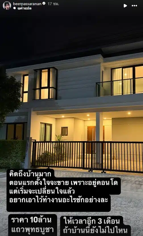 “คิดถึงบ้านมาก ตอนแรกตั้งใจจะขาย เพราะอยู่คอนโด แต่เริ่มจะเปลี่ยนใจแล้ว อยากเอาไว้ทำงานอะไรสักอย่างละ ราคา 10 ล้าน แถวพุทธบูชา ให้เวลาอีก 3 เดือน ถ้าบ้านนี้ยังไม่ไปไหน”