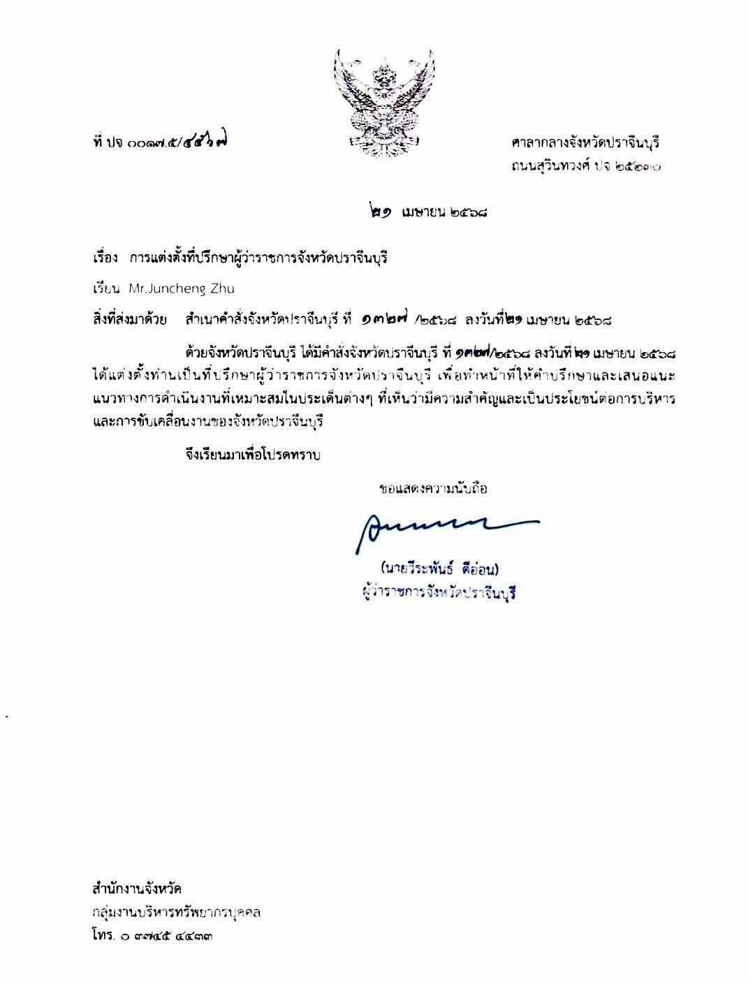 เพจ CSI LA ได้โพสต์ข้อความเฟซบุ๊กและเอกสาร รายงานว่า “หนังสือทางราชการจากจังหวัด ปราจีนบุรี ลงนามโดยผู้ว่าฯ แต่งตั้งชายชาวจีนชื่อ Mr. Juncheng Zhu เป็น “ที่ปรึกษาผู้ว่าราชการจังหวัด” อย่างเป็นทางการ