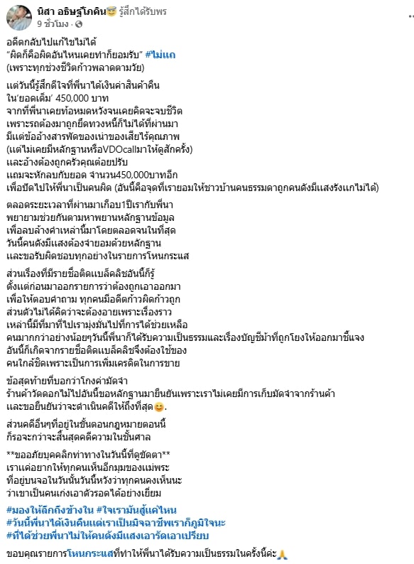 “อดีตกลับไปแก้ไขไม่ได้ “ผิดก็คือผิดอันไหนเคยทำก็ยอมรับ” #ไม่เเถ (เพราะทุกช่วงชีวิตก้าวพลาดตามวัย) เเต่วันนี้รู้สึกดีใจที่พี่นาได้เงินค่าสินค้าคืนใน‘ยอดเต็ม’ 450,000 บาท จากที่พี่นาเคยท้อหมดหวังจนเคยคิดจะจบชีวิต เพราะรถต้องมาถูกยึด ทวงหนี้ก็ไม่ได้