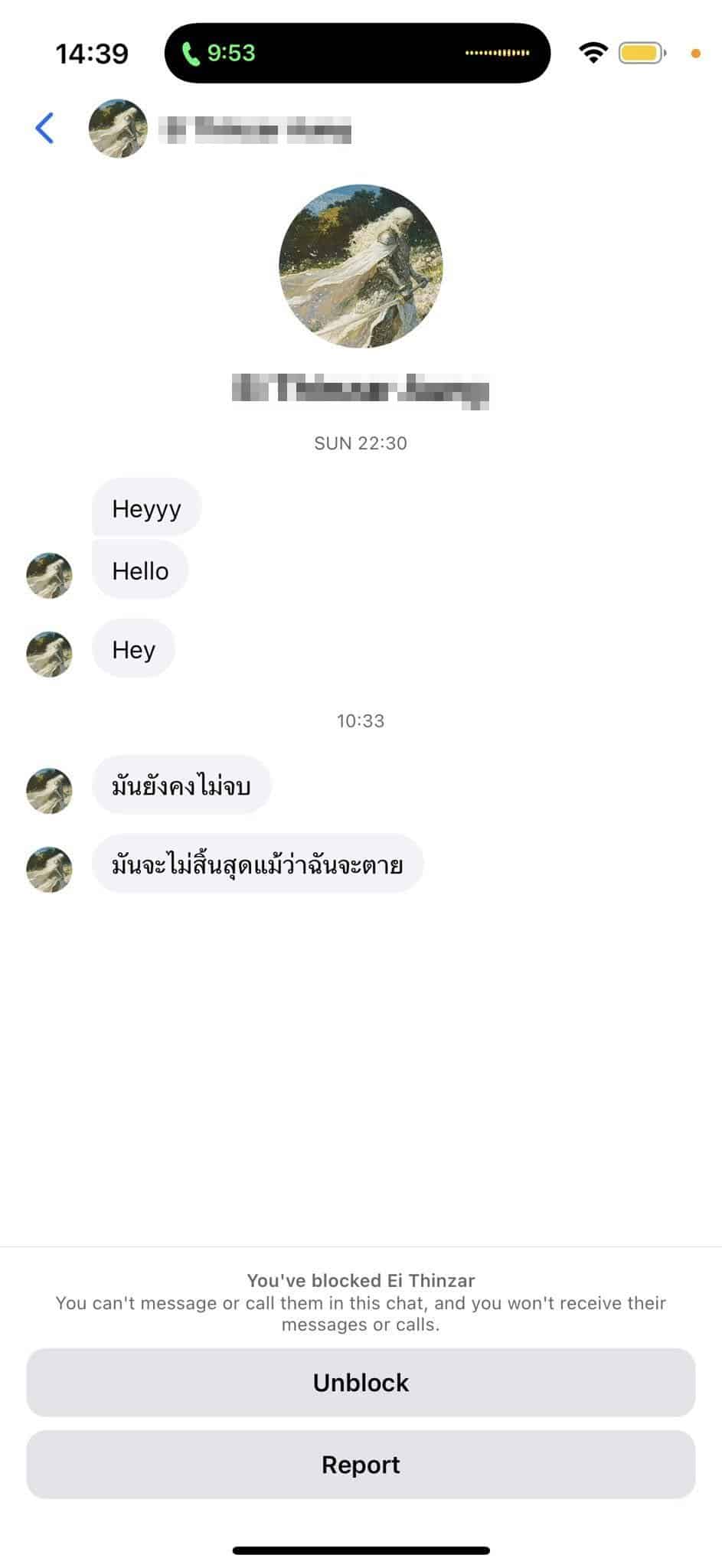 ซึ่งชายคนนี้ก็ได้ส่งข้อความมาไม่หยุด จนทางลินเองก็เริ่มรู้สึกแปลก ๆ และได้ทำการบล็อกไป แต่หลังจากนั้น พม่าคนนี้ก็สมัครแอคเค้าท์ใหม่มาส่งข้อความซ้ำ ๆ ทั้งทาง instragram , Facebook , TikTok รวม ๆ กันเป็น 10-20 แอคเคาท์ ซึ่งลินตามบล็อกทุกแอคเคาท์ที่เขาส่งข้อความมา