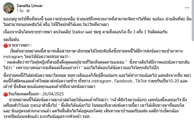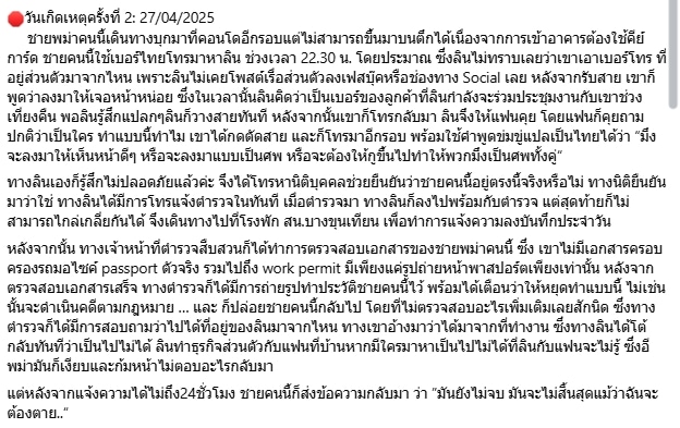 กำลังเป็นเรื่องร้อนในโลกออนไลน์ เมื่อสาวรายหนึ่งออกมาโพสต์เฟซบุ๊กขอความช่วยเหลือจากสังคมและหน่วยงานที่เกี่ยวข้อง หลังจากเธอถูกชายพม่าส่งข้อความข่มขู่-บุกมาดักรอถึงหน้าคอนโดต่อเนื่อง 3 วันติด จนใช้ชีวิตอย่างไม่ปลอดภัย ไม่สามารถนอนหลับหรือใช้ชีวิตได้ปกติ แต่เมื่อไปแจ้งความกับเจ้าหน้าที่ตำรวจแล้ว กลับได้คำตอบแค่ว่า “เหตุยังไม่เกิด” และปล่อยตัวชายพม่าคนนั้นกลับไป โดยเรื่องราวดังกล่าวเจ้าของโพสต์นามว่า “ลิน” ได้เล่าเหตุการณ์ที่เกิดขึ้น พร้อมแนบคลิปวิดีโอชายคนดังกล่าวลงในหน้าเฟซบุ๊กส่วนตัว ระบุว่า