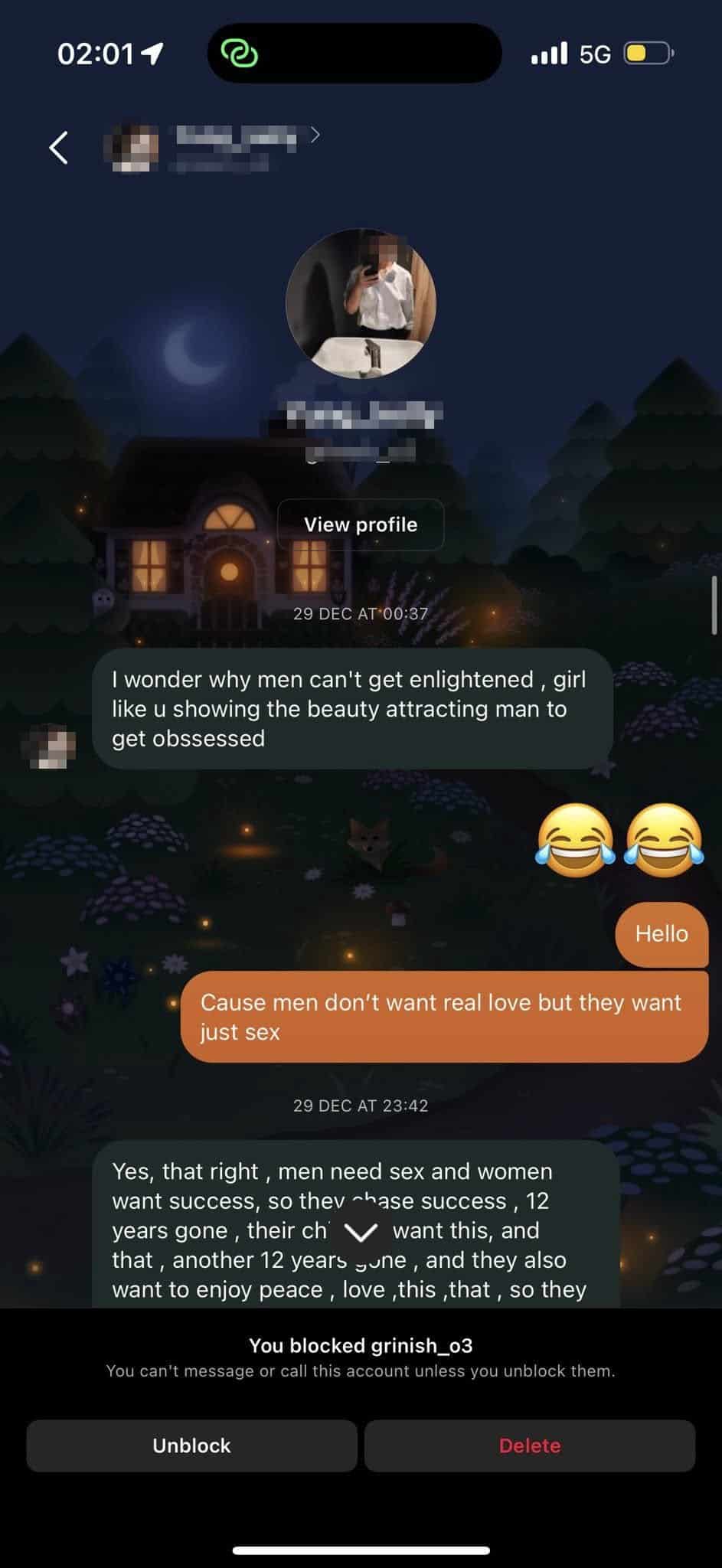 ซึ่งชายคนนี้ก็ได้ส่งข้อความมาไม่หยุด จนทางลินเองก็เริ่มรู้สึกแปลก ๆ และได้ทำการบล็อกไป แต่หลังจากนั้น พม่าคนนี้ก็สมัครแอคเค้าท์ใหม่มาส่งข้อความซ้ำ ๆ ทั้งทาง instragram , Facebook , TikTok รวม ๆ กันเป็น 10-20 แอคเคาท์ ซึ่งลินตามบล็อกทุกแอคเคาท์ที่เขาส่งข้อความมา