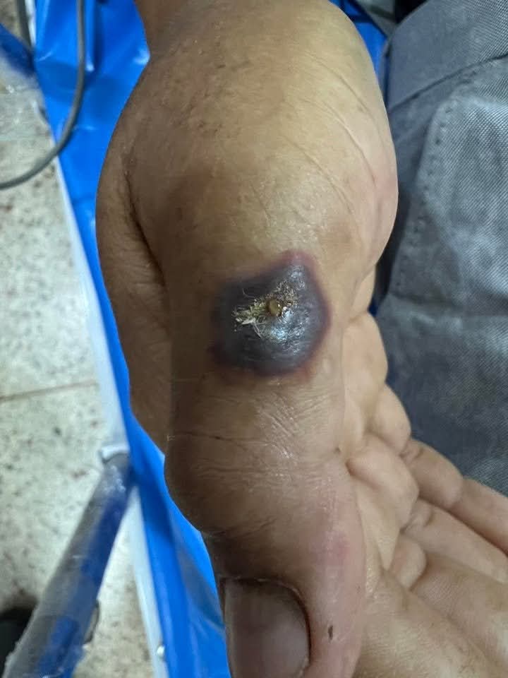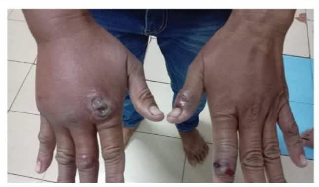 ผู้ป่วยเป็นชายซึ่งมีแผลบริเวณมือ หลังรับประทานเนื้อวัว และเข้ารับการรักษาในโรงพยาบาลด้วยอาการแผลที่ผิดปกติ ทางทีมแพทย์ประจำชุมชนได้สังเกตความผิดปกติจากลักษณะของแผล ซักประวัติการใช้ชีวิตของผู้ป่วย จึงรีบส่งตรวจเชิงลึกอย่างละเอียด พบว่า ผู้ป่วยมีประวัติเคยเลี้ยงวัว อีกทั้งยังมีพฤติกรรมบริโภคเนื้อวัวดิบในงานบุญ